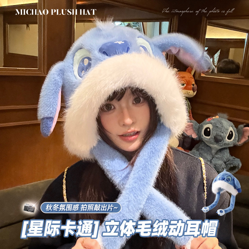 耳朵会动迪士尼史迪仔奇帽子女冬季加厚保暖可爱毛绒帽护耳套头帽
