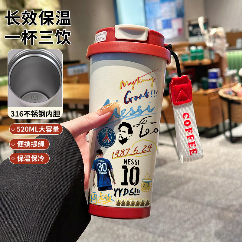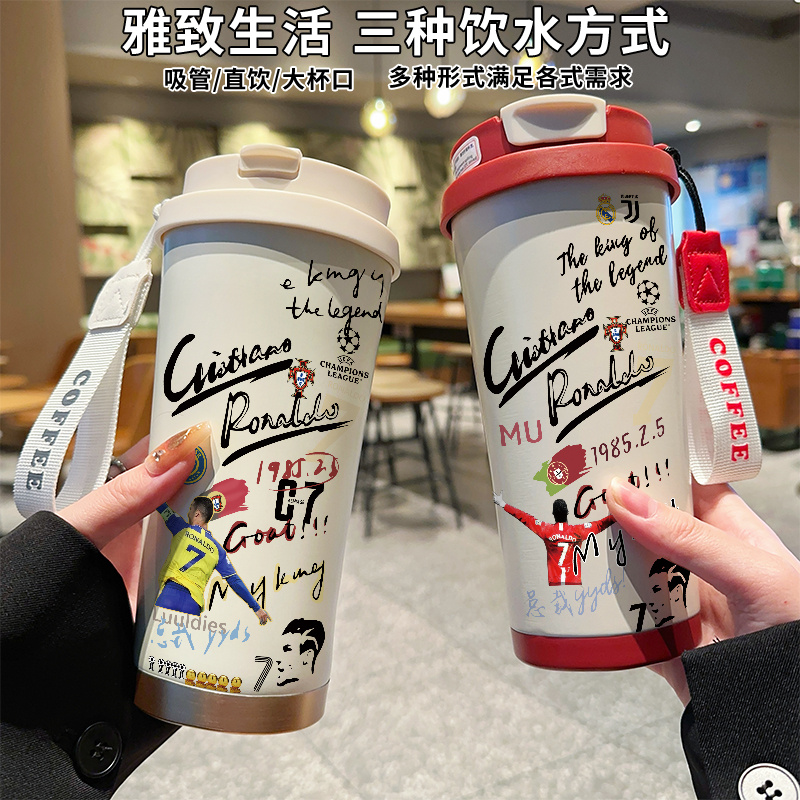 曼城皇马保温杯足球运动水杯子高颜值C罗梅西吸管双饮口水壶男316