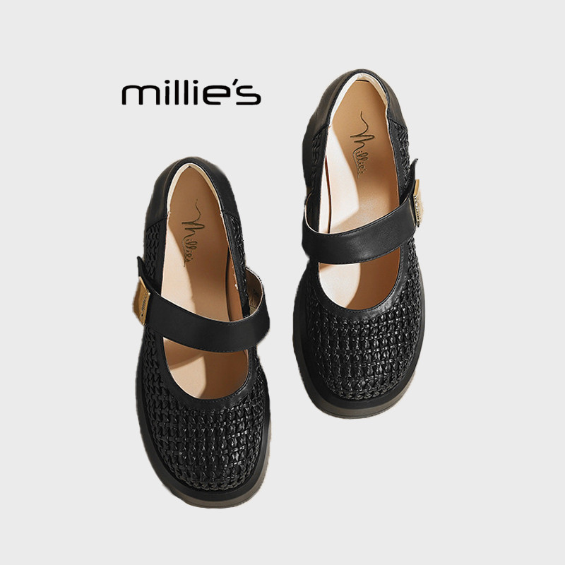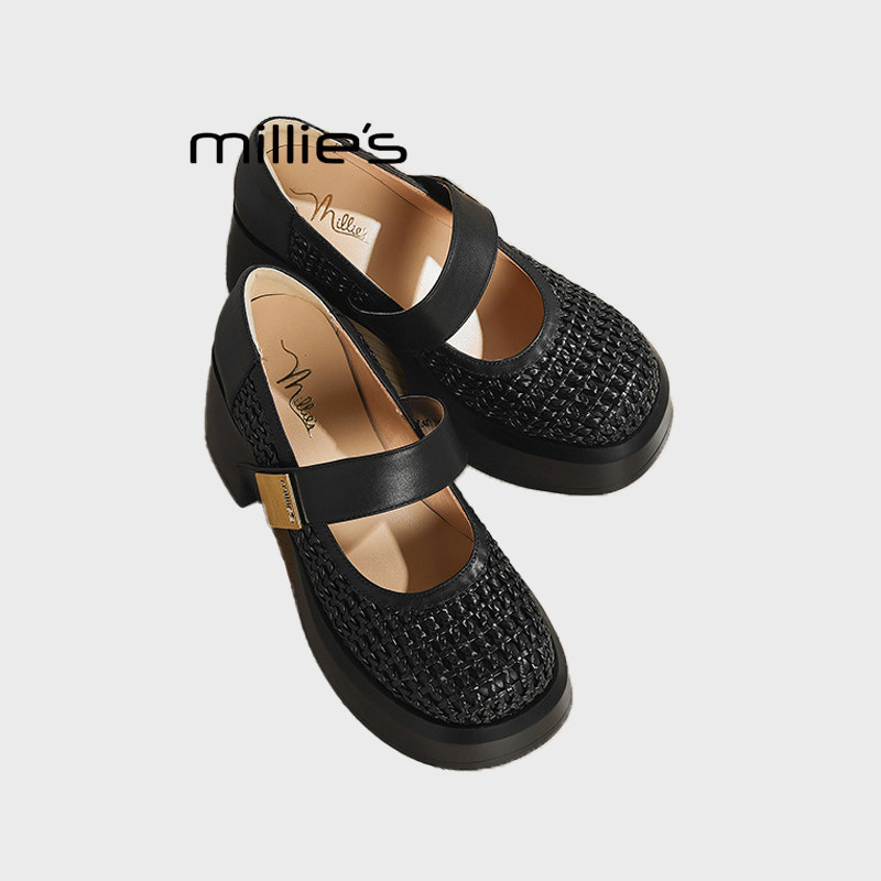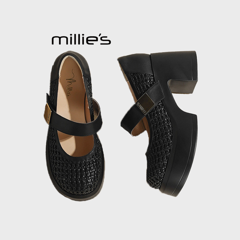 MILLIE'S/妙丽真皮厚底凉鞋女新款夏季女鞋编织透气玛丽珍高跟鞋
