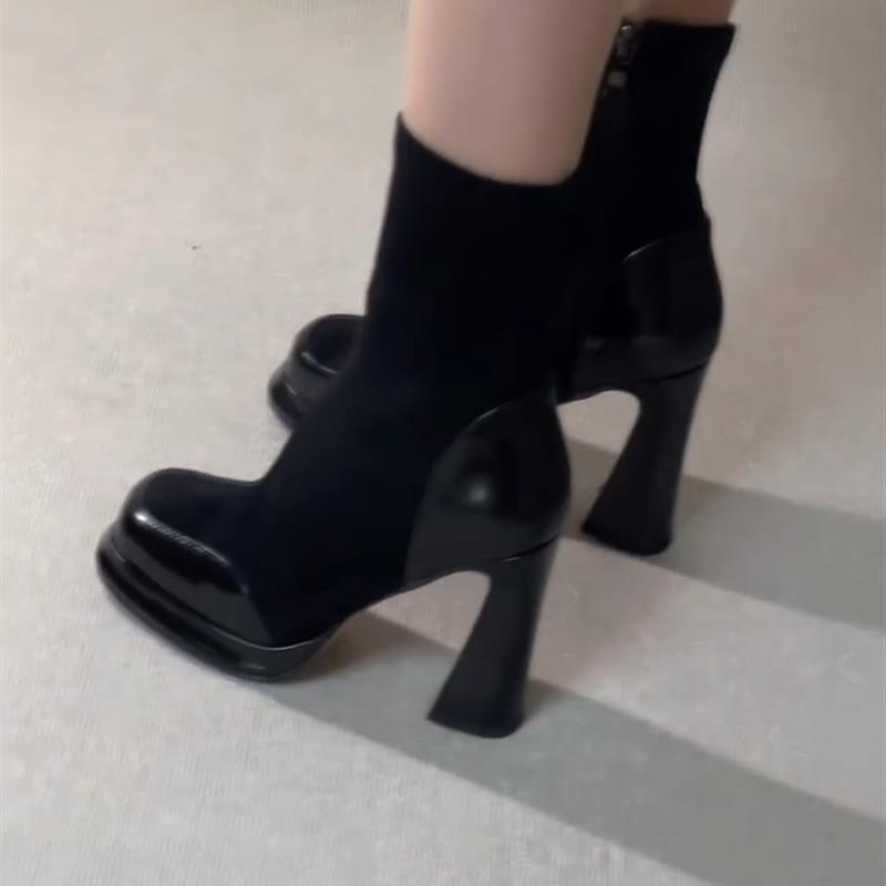 羊皮版~法式方头粗跟短靴女2025新款秋冬高跟短筒拼接弹力瘦瘦靴