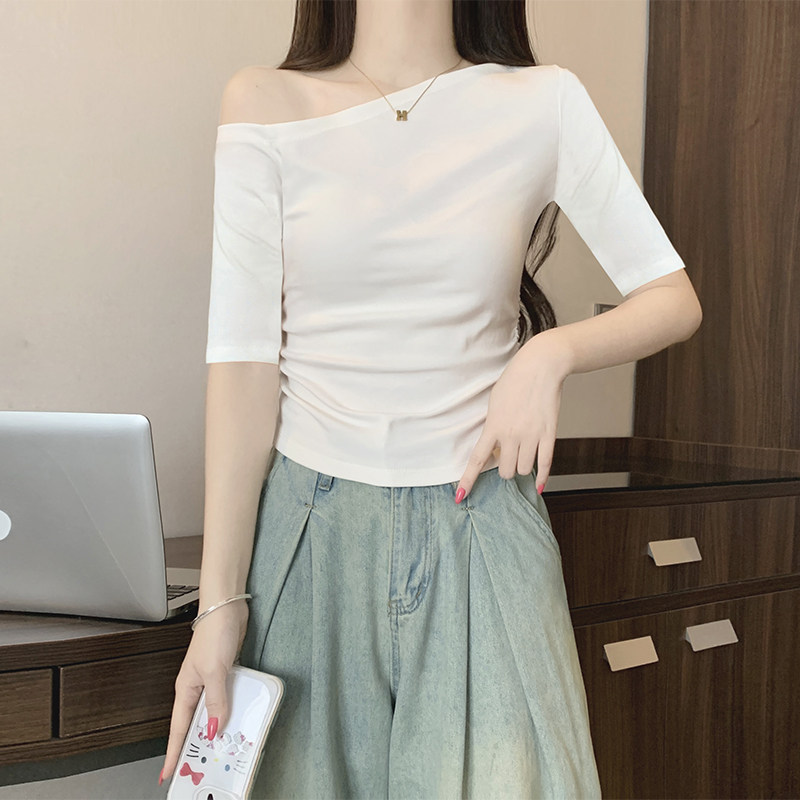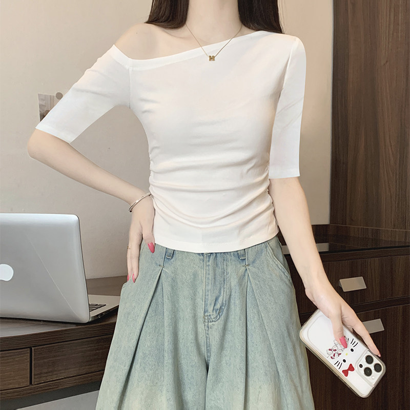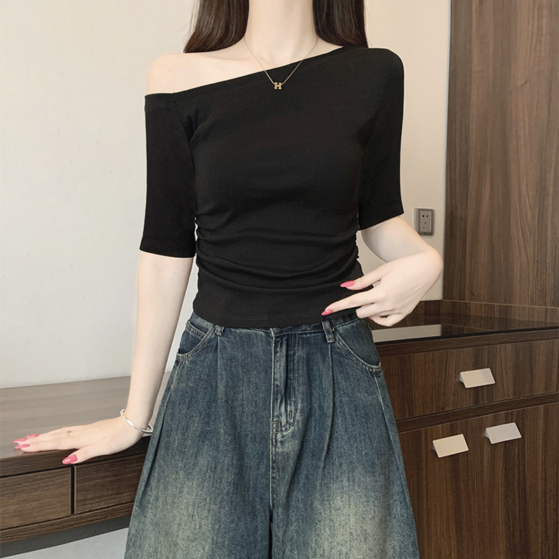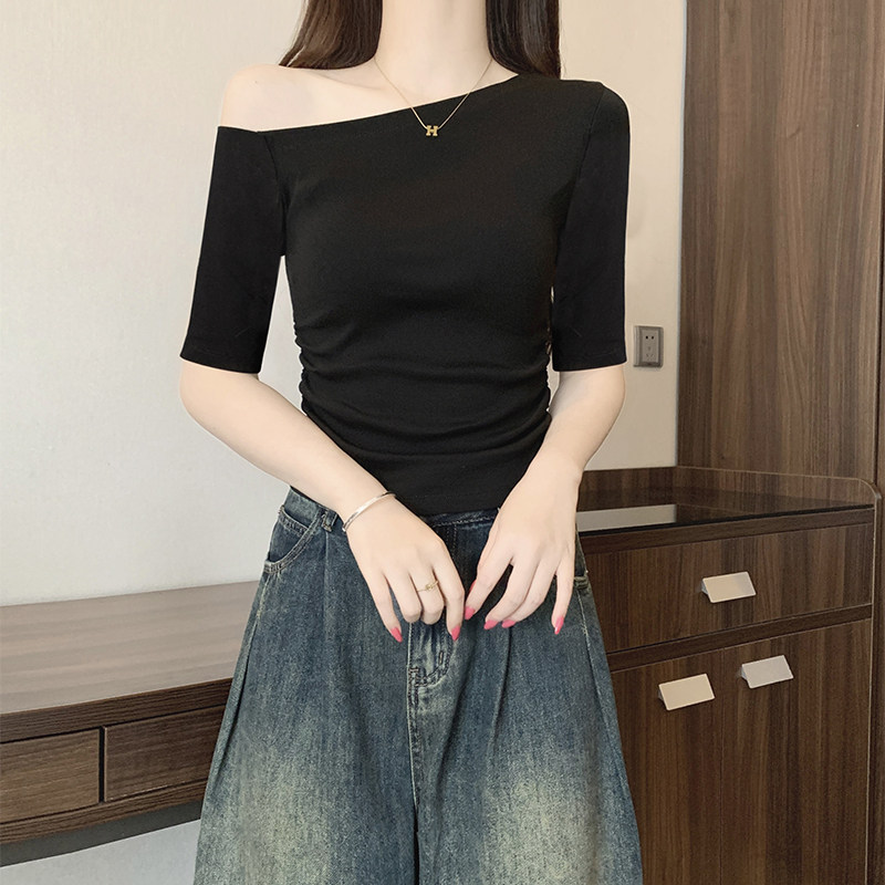 黑色斜肩打底衫女内搭2025新款春秋设计感纯棉五分袖修身T恤上衣