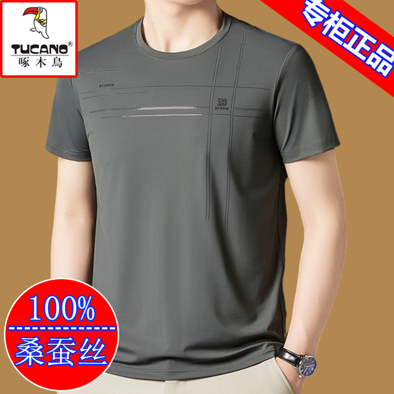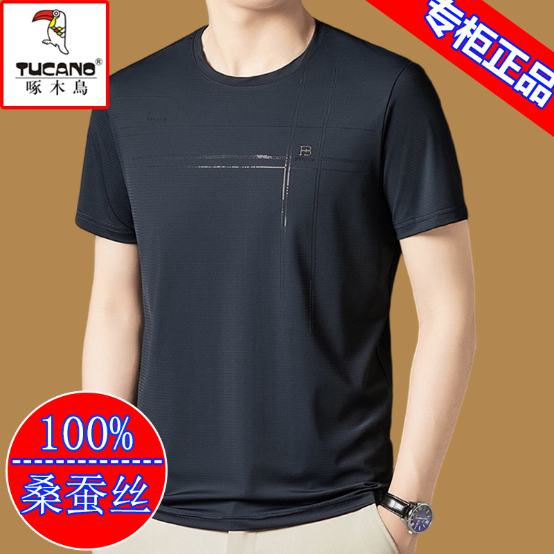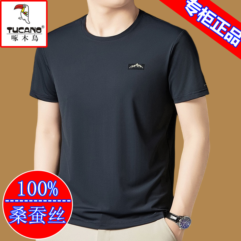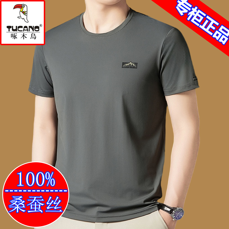 啄木鸟桑蚕丝短袖t恤男士2025新款圆领体恤衫夏季冰丝半袖男上衣T