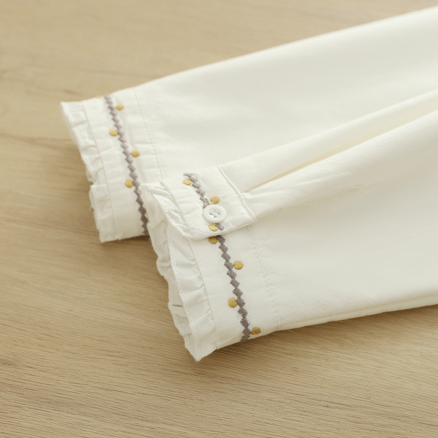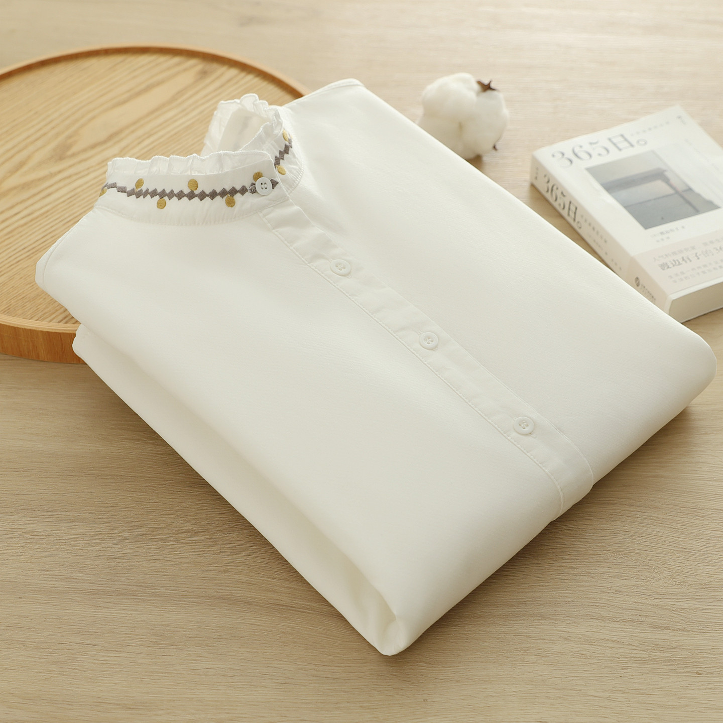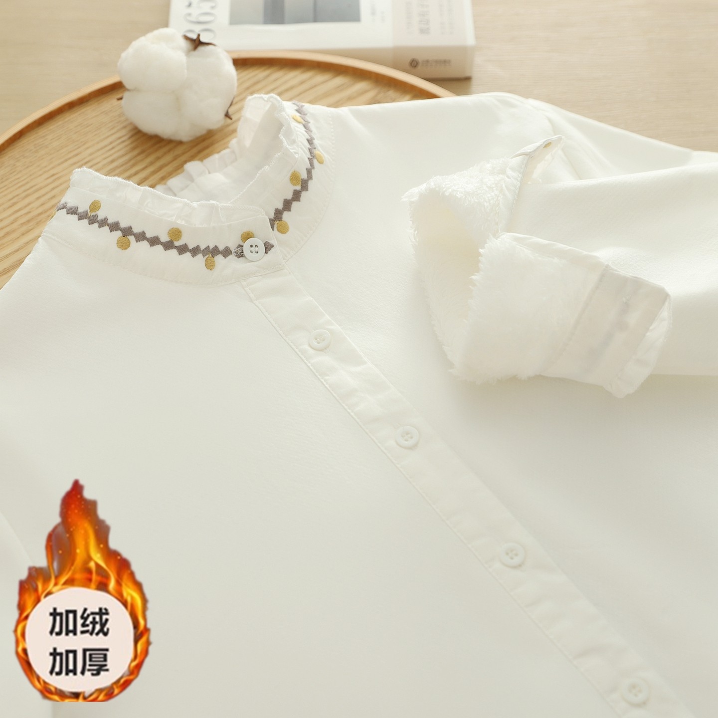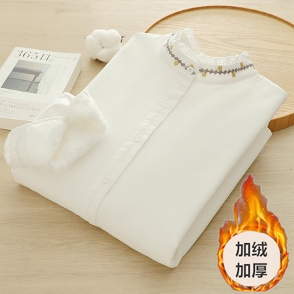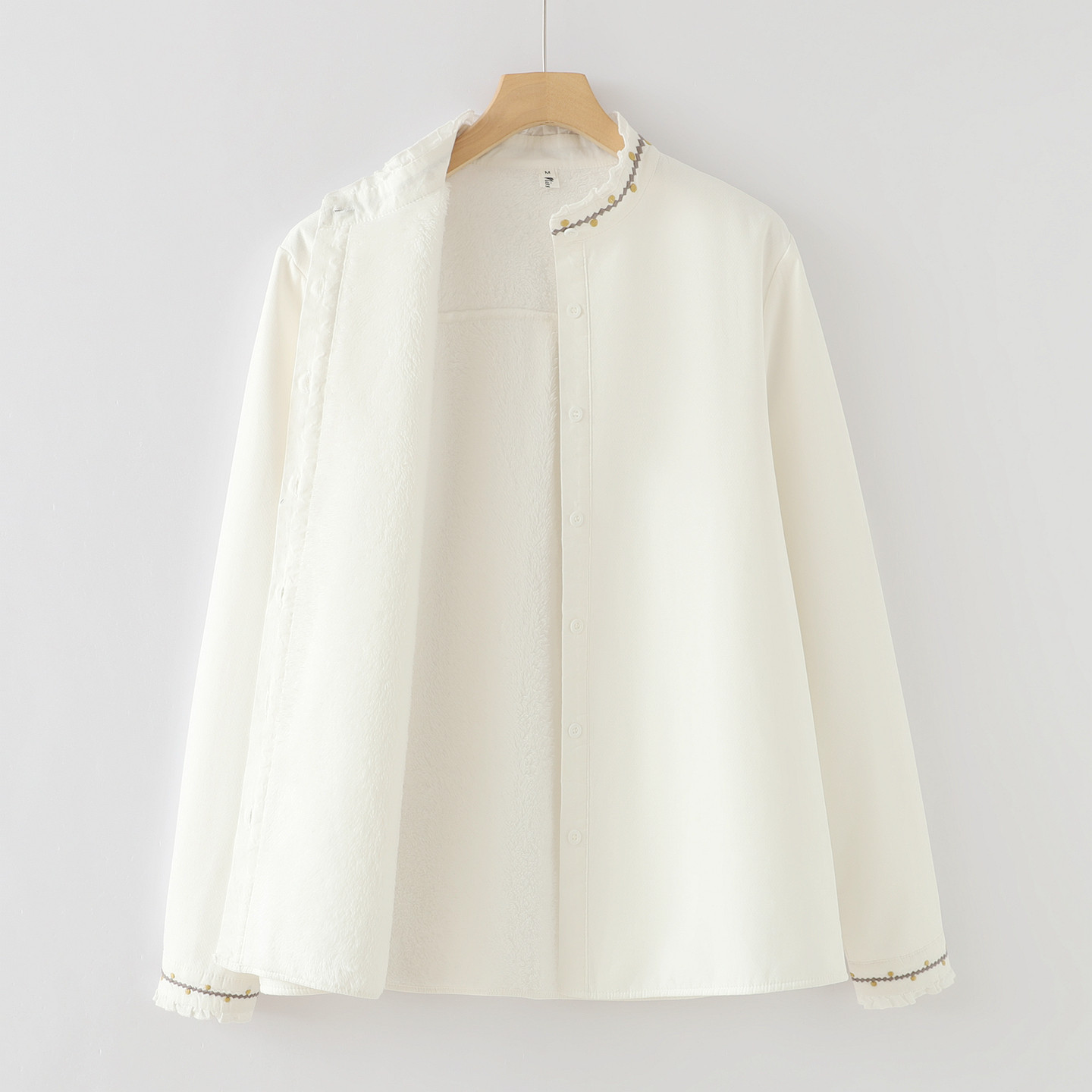 2025冬季文艺小清新波普刺绣方块花边立领纯棉加绒加厚衬衫女长袖