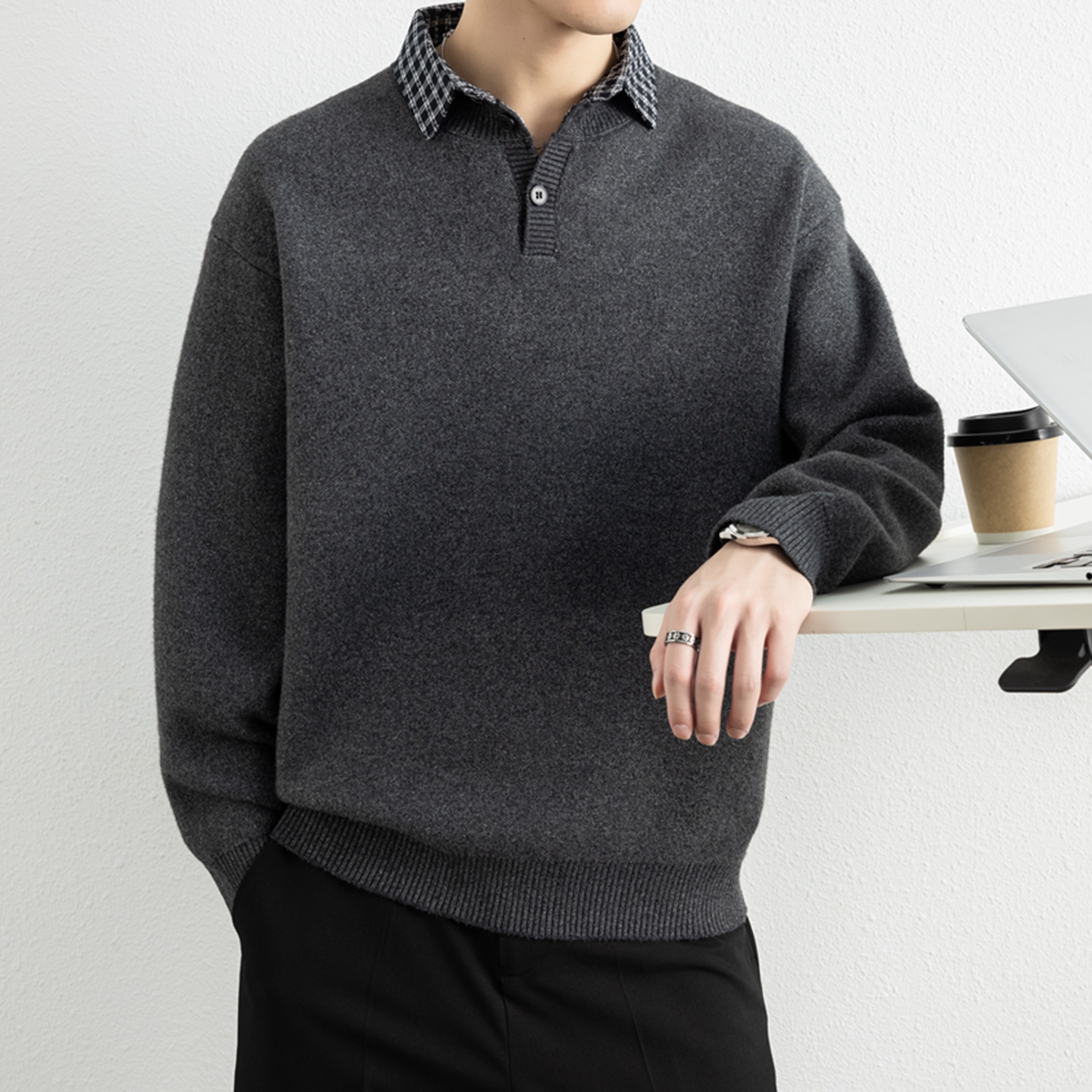 侨迪蒙拉轻奢格子衬衫领针织衫男士秋冬季假两件纽扣潮牌毛衣内搭