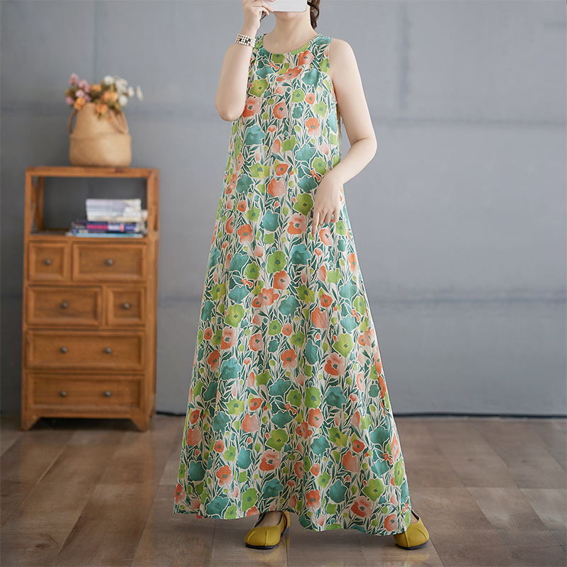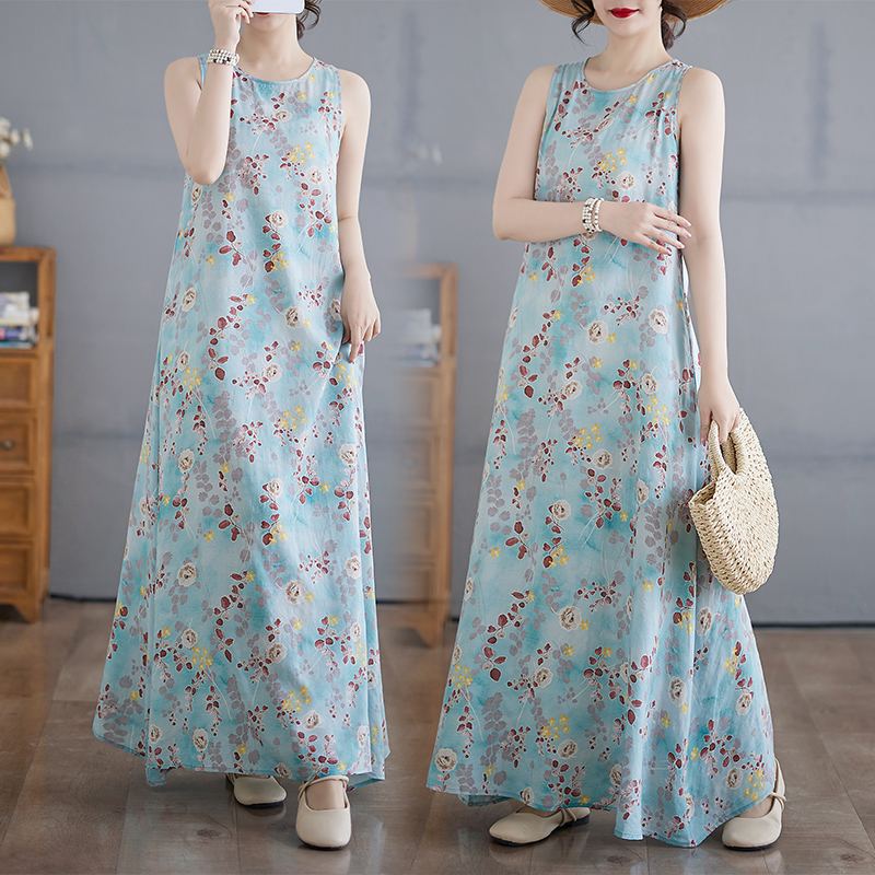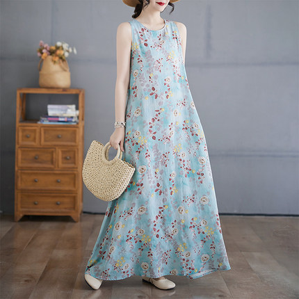 棉麻背心连衣裙 过膝碎花长裙子印花度假高腰 轻薄过膝好穿好看