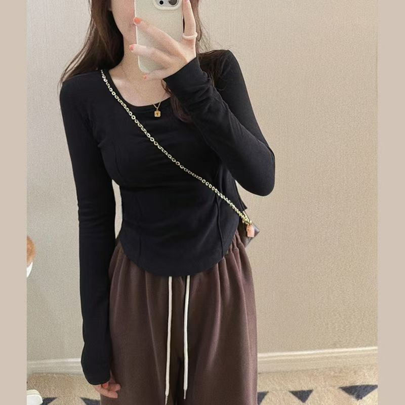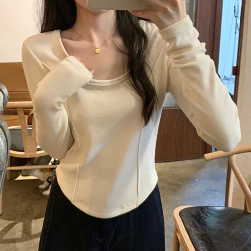 纯欲软糯德绒细鱼骨弧边U领显胸打底衫大码设计感长袖正肩T恤女A