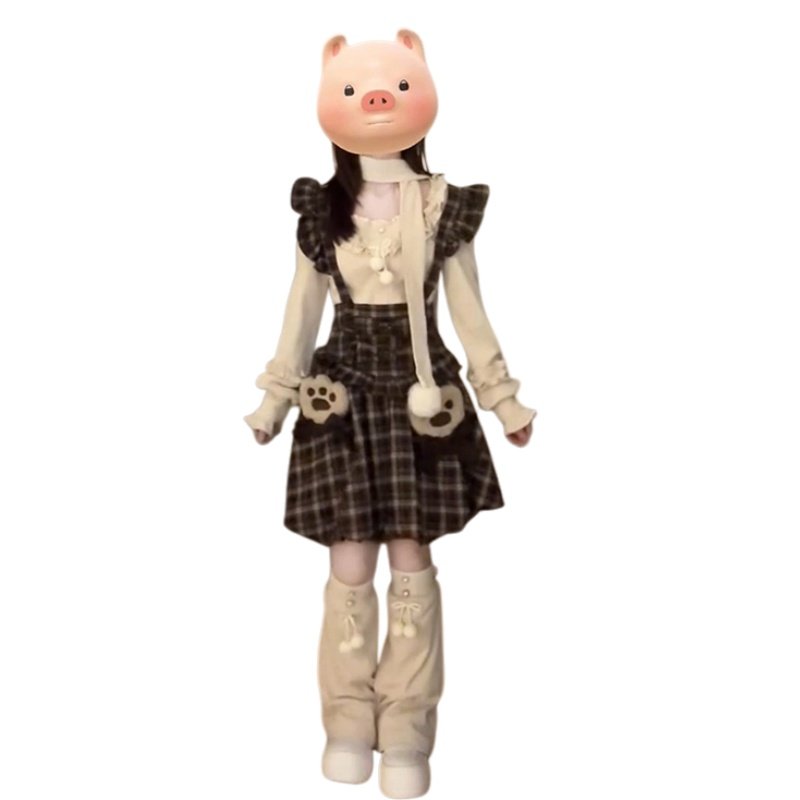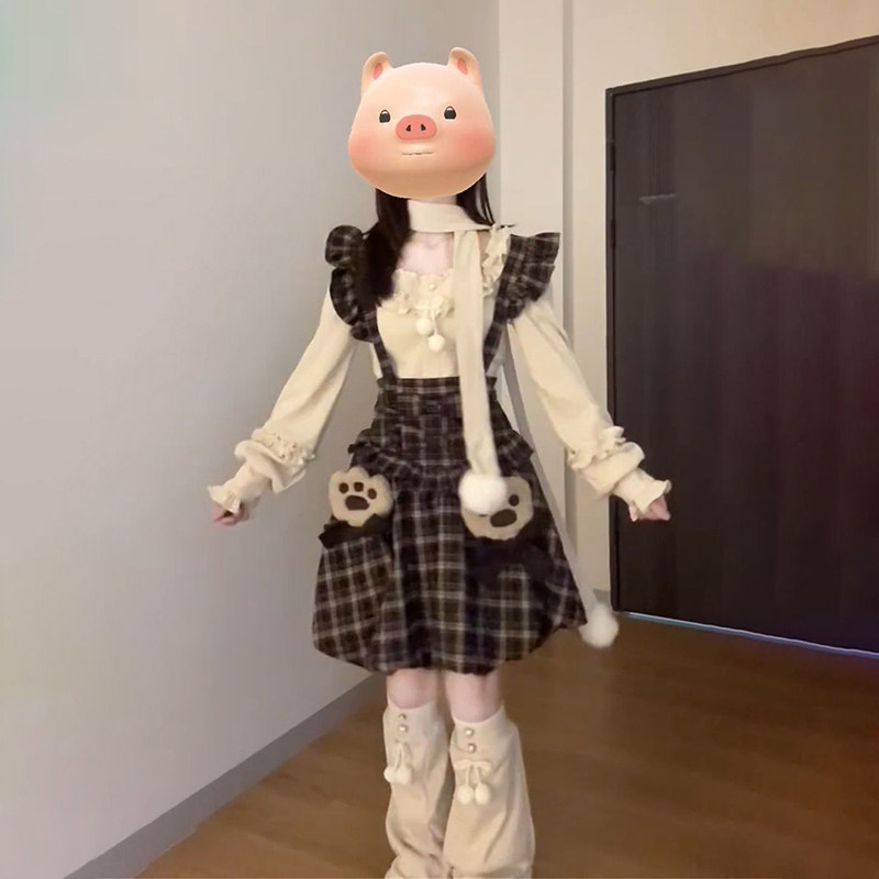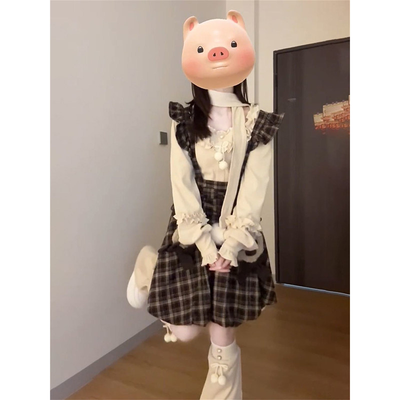 美式复古学院风减龄花苞背带连衣裙叠穿方口领木耳边上衣两件套装