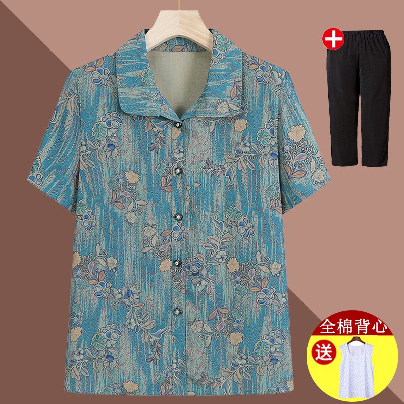 奶奶夏装衬衫短袖上衣70岁老年人妈妈夏季翻领衬衣套装老太太衣服