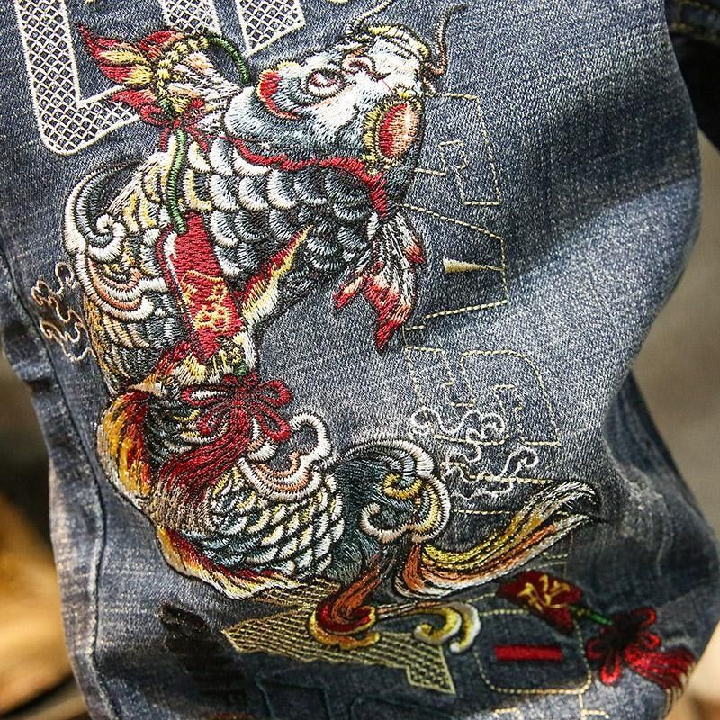 高端刺绣牛仔裤男青年弹力直筒修身小脚裤子韩版时尚复古潮牌长裤