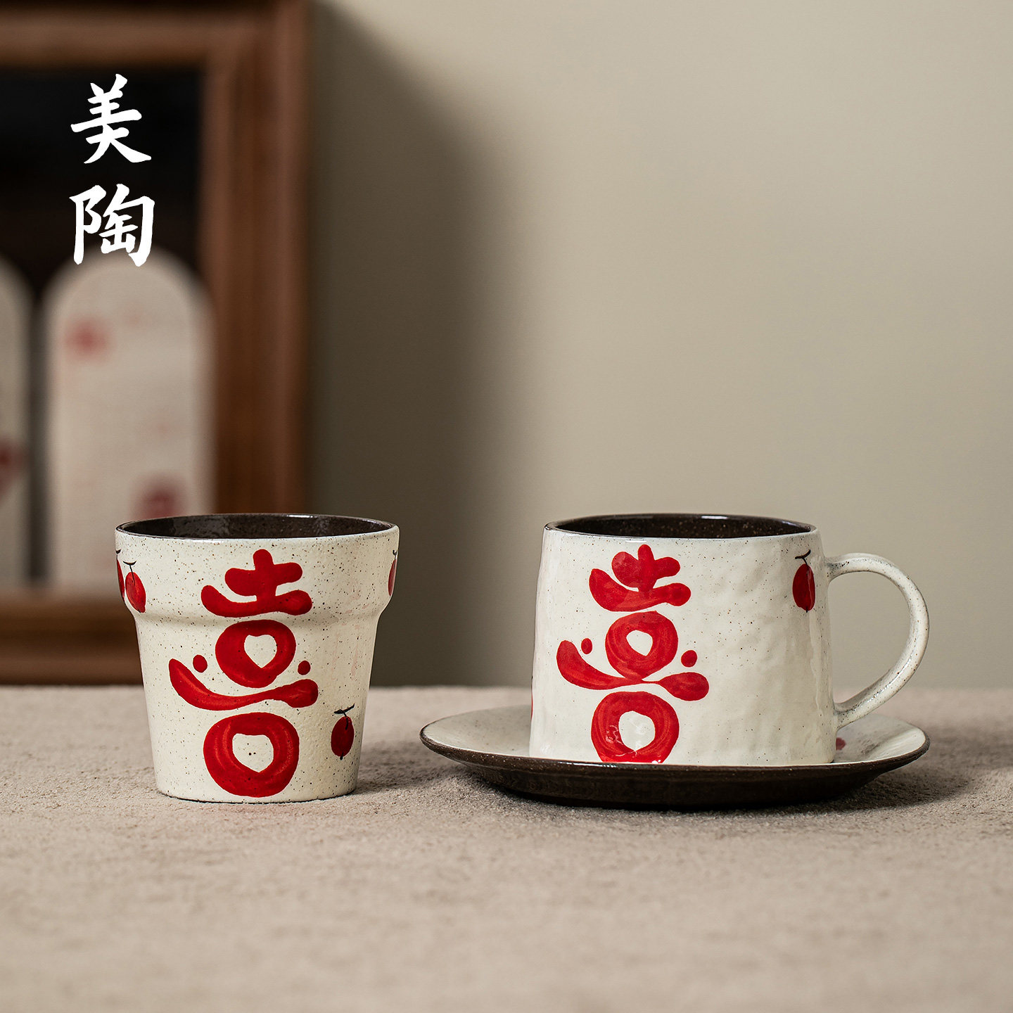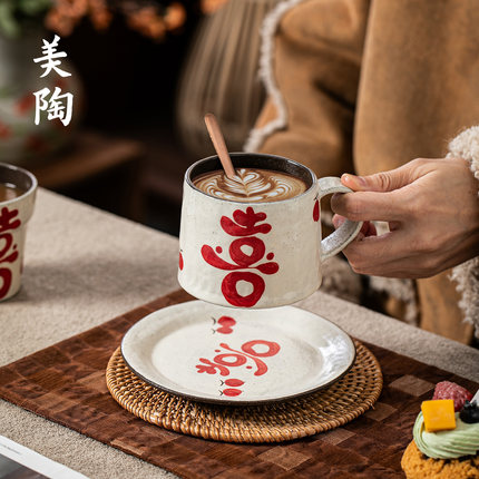 景德镇陶瓷杯马克杯手绘喜字咖啡杯结婚伴手礼釉下彩手握杯茶杯子