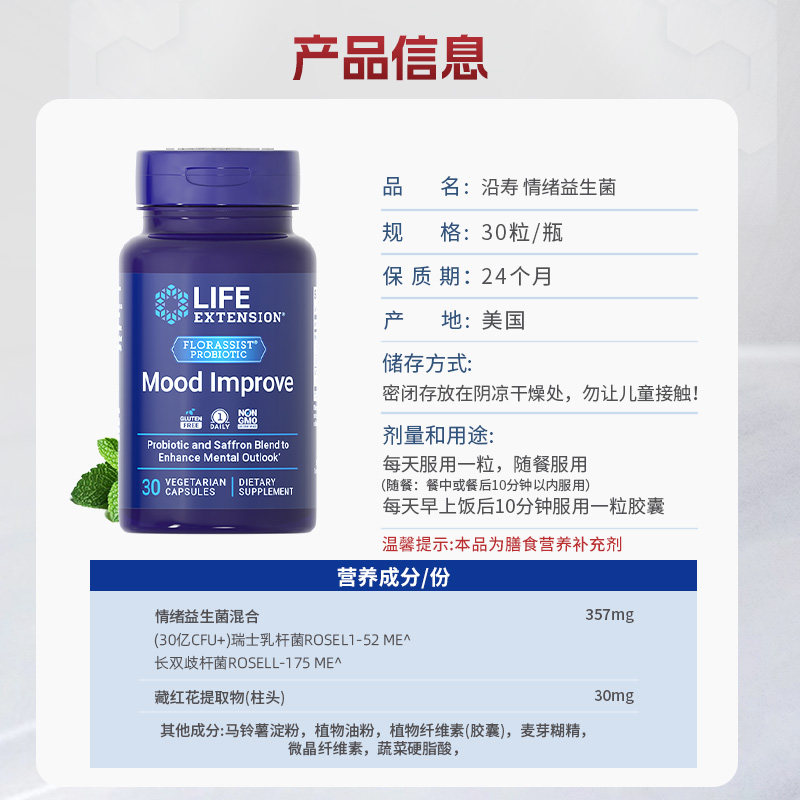 沿寿LIFE情绪平衡益生菌舒缓压力放松稳定有机藏红花植物胶囊睡眠