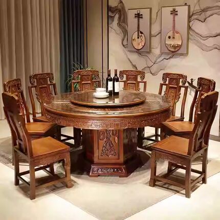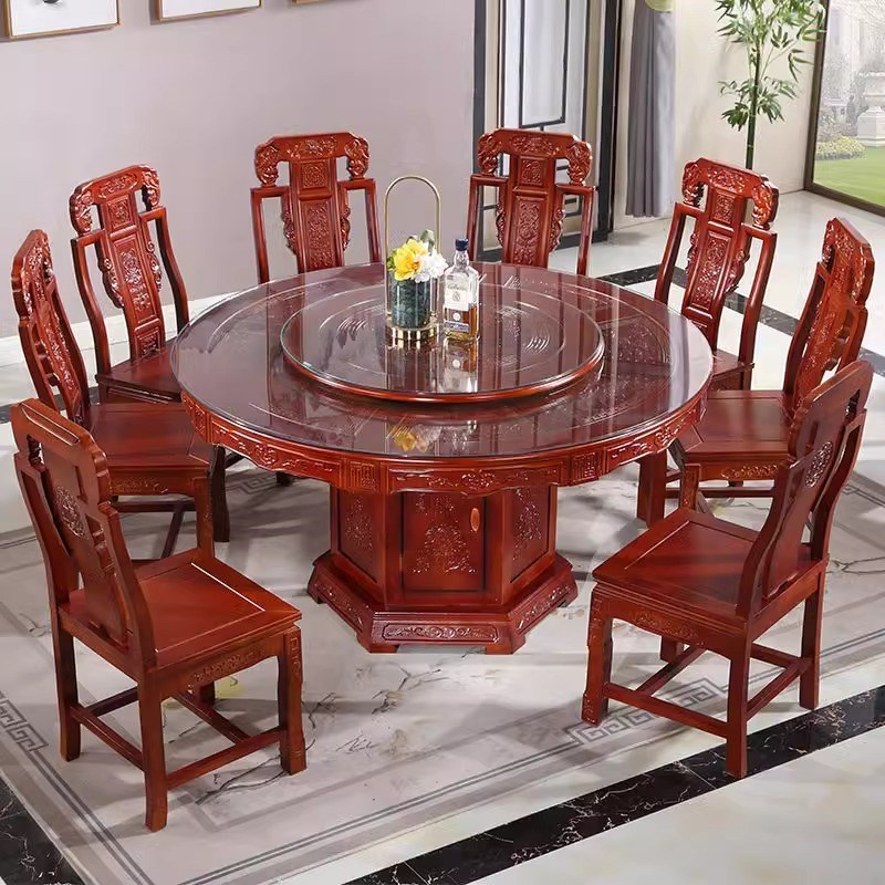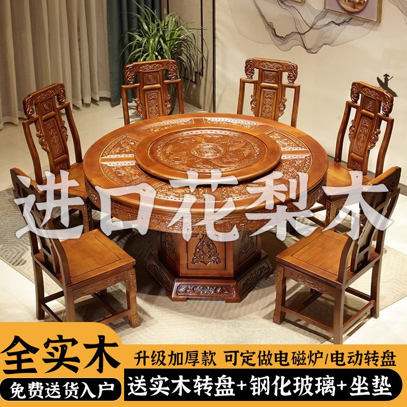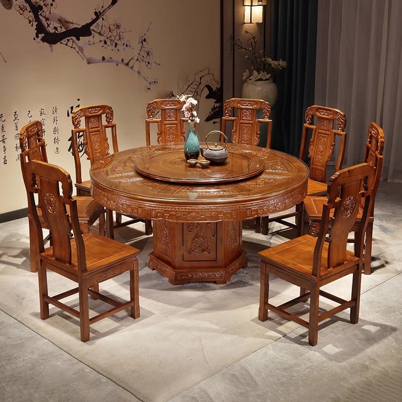 全实木餐桌椅组合圆形带转盘中式仿古雕花大圆桌家用橡木吃饭桌子