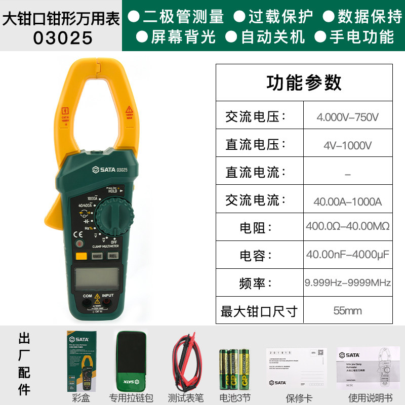 世达工具大开口钳形万用表数字钳形表交直流电工钳式电流表03025