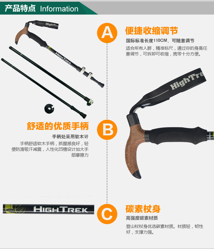 超轻小弯柄行山杖碳素纤维登山杖