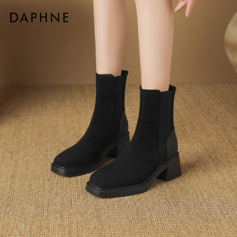 达芙妮短靴绒面切尔西瘦瘦靴高跟
