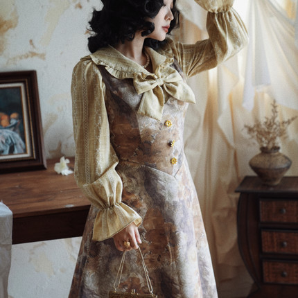致卡萝自制-梵高的调色板-复古刺绣衬衫麂皮背心裙套装