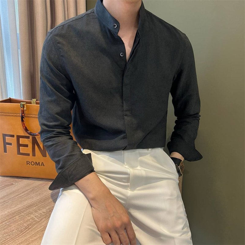 NR先生复古做旧暗扣设计弹力男衬衫新中式纯色修身立领长袖衬衣潮