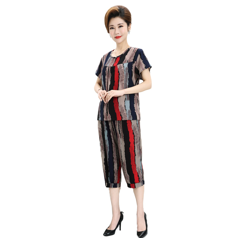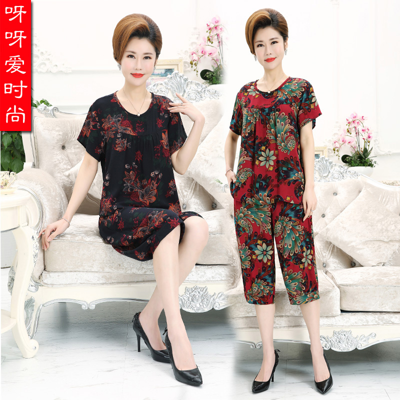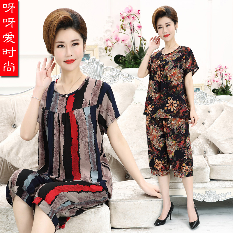 中老年短袖套装女2021夏装棉绸睡衣居家两件套妈妈装宽松大码t恤