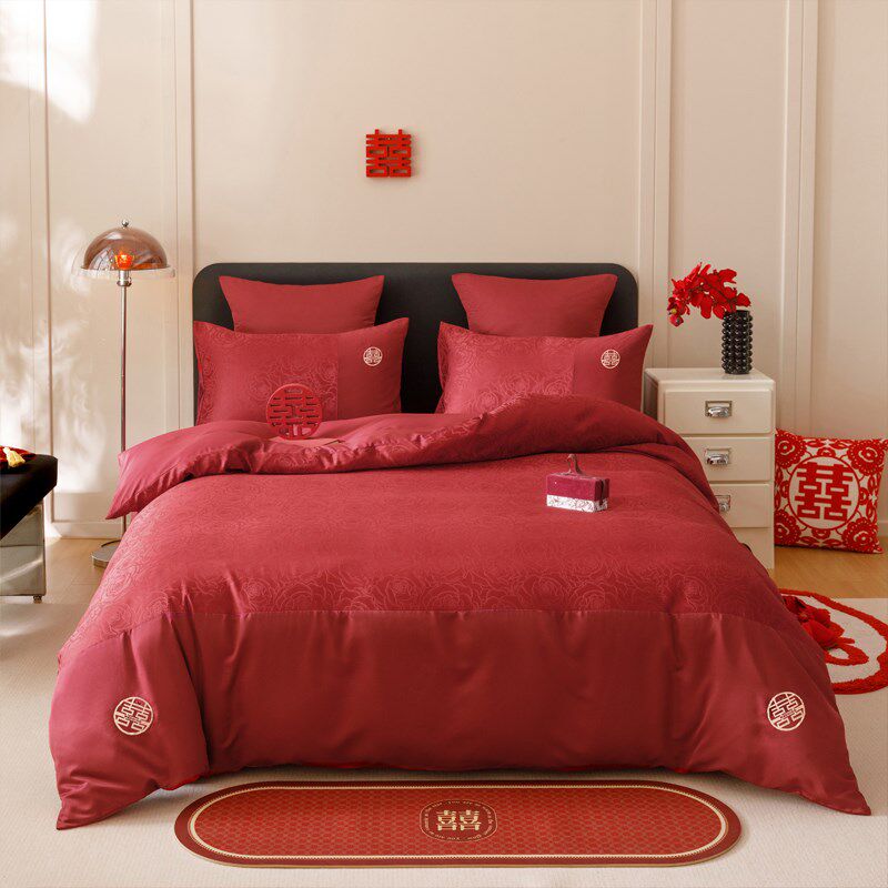 简约160支长绒棉结婚四件套红色印花卉被套床单婚庆婚房床品4