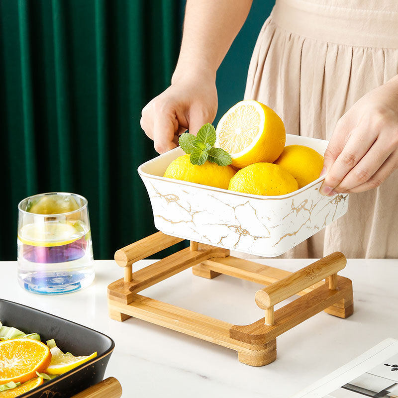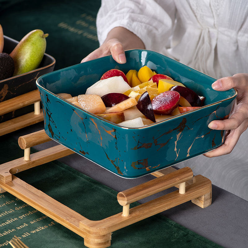 北欧创意水果沙拉调味碗木架方形大理石纹陶瓷果盘简约方形甜品盘