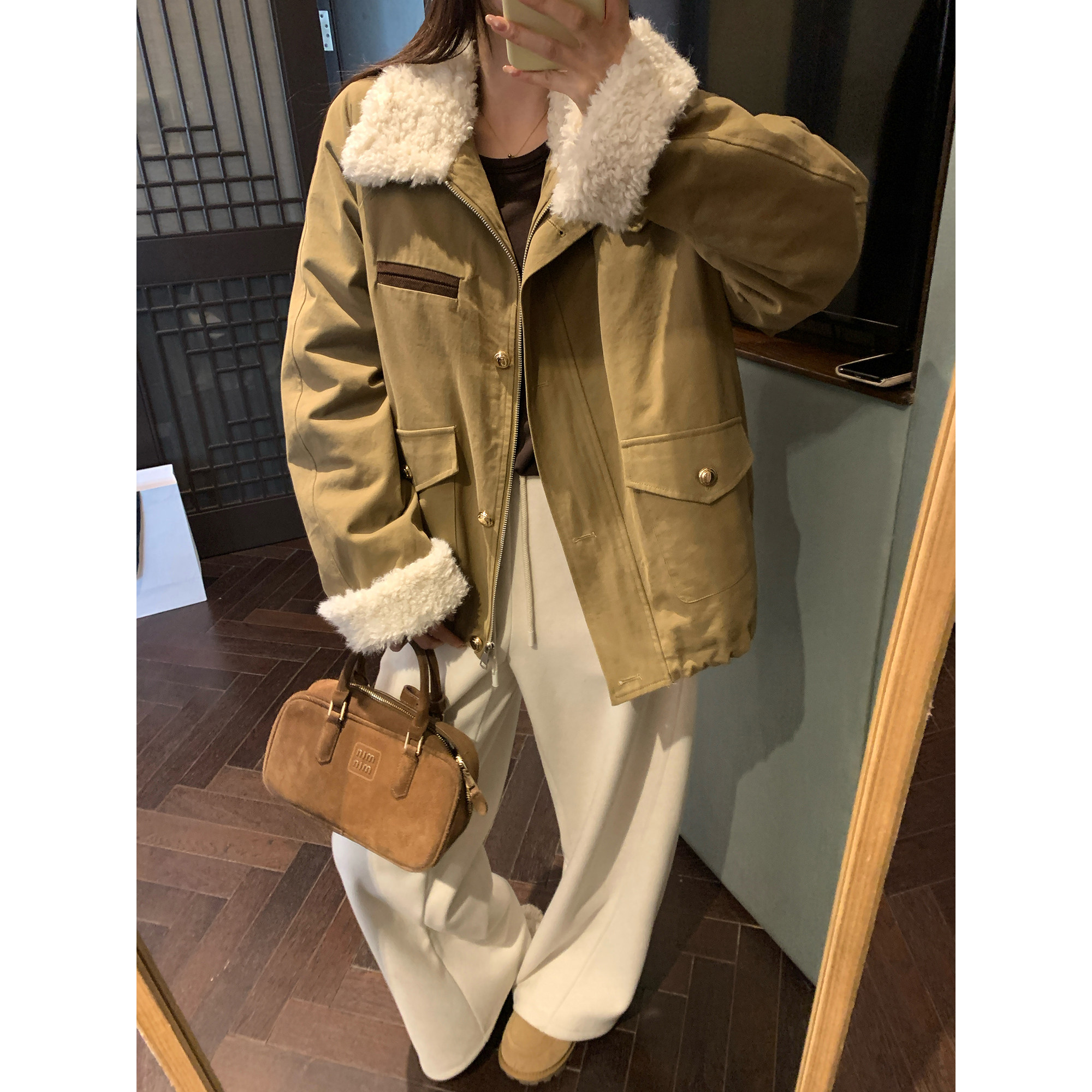 NAZ那子大码冬季90白鸭绒羊羔卷毛派克胖mm保暖毛领拼接羽绒外套