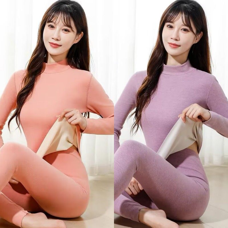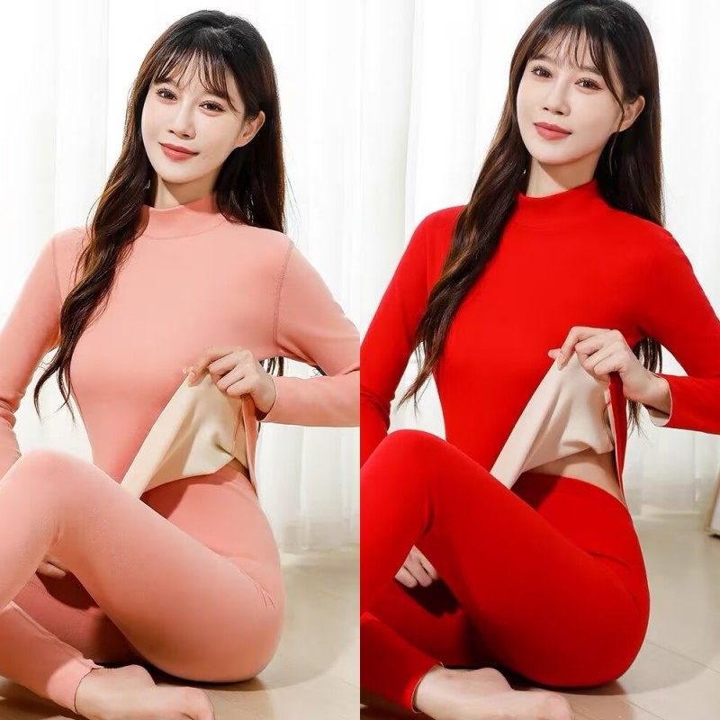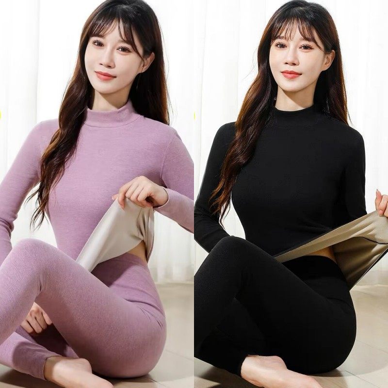女士中高领加厚加绒保暖内衣套装秋冬大码德发热秋衣秋裤纯棉毛衫