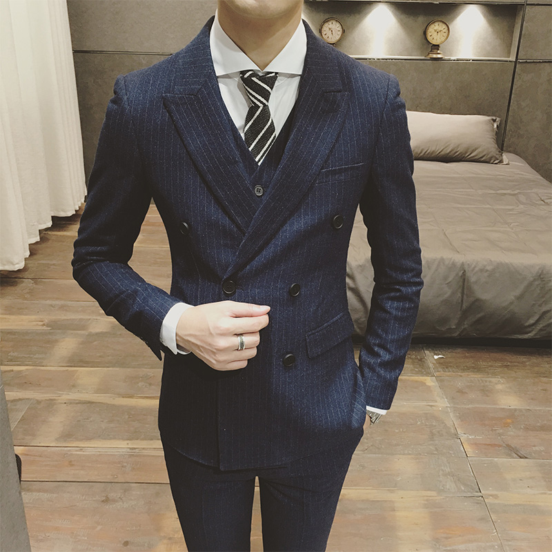 竖条纹西装三件套男士韩版