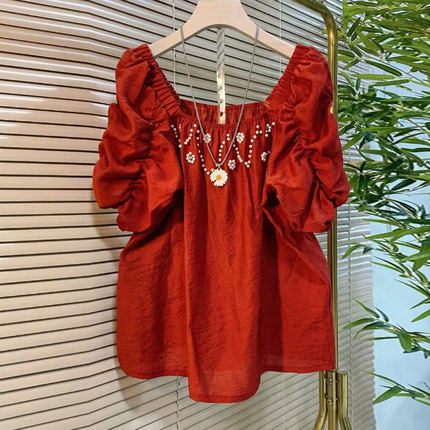 大码女装方领钉珠花朵短袖衫