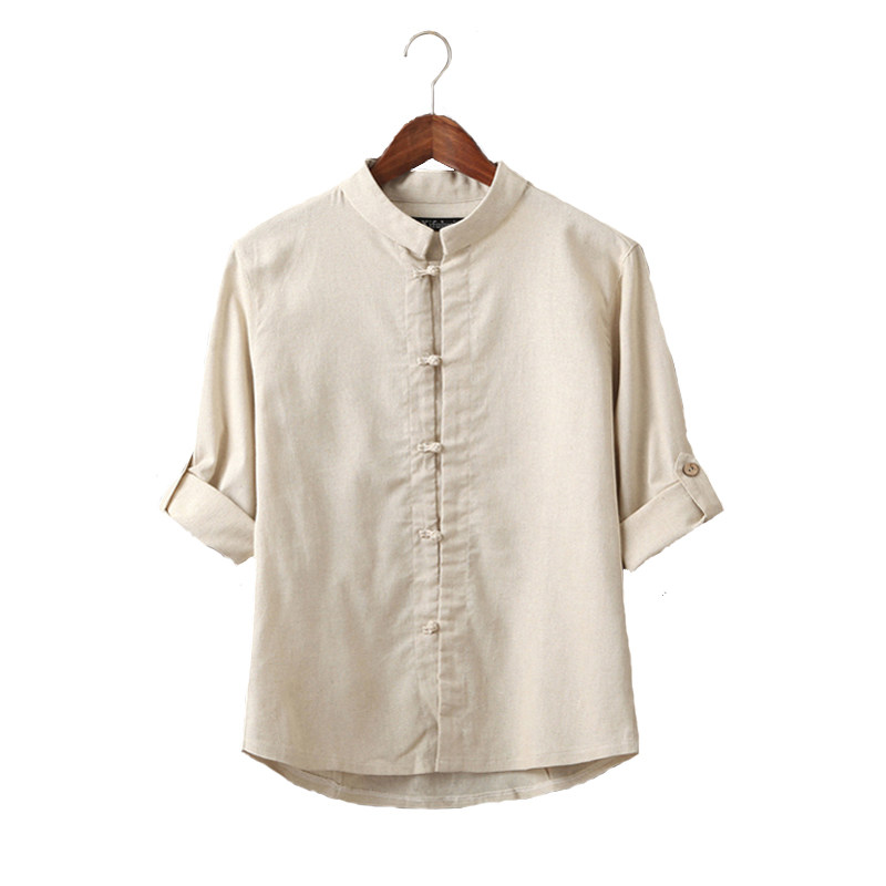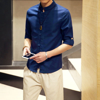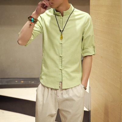 中国风男装汉服棉麻衬衫亚麻立领盘扣七分袖上衣日系复古大码唐装