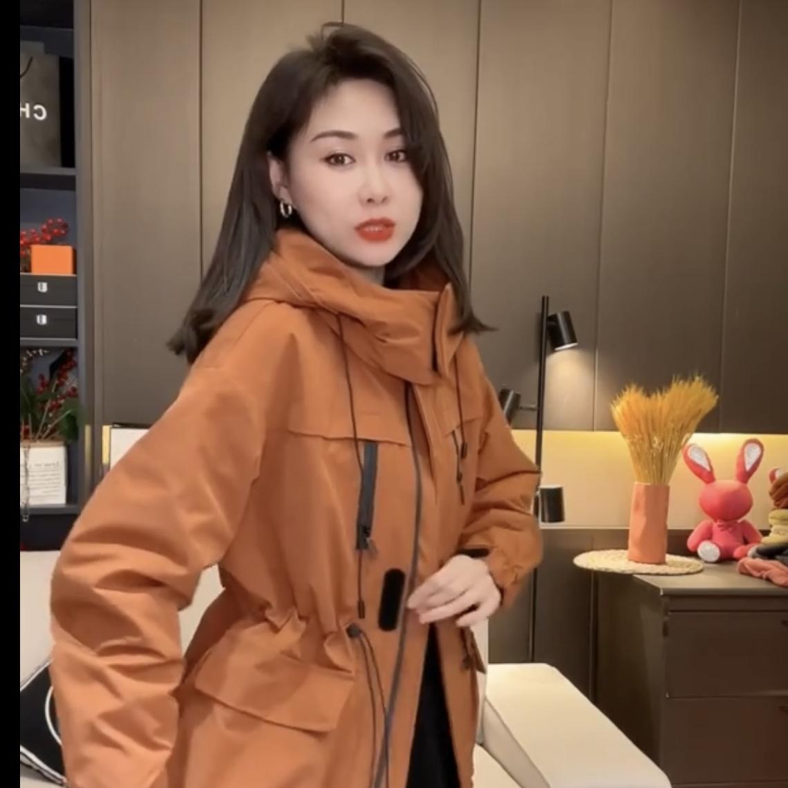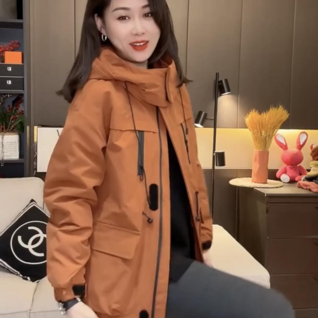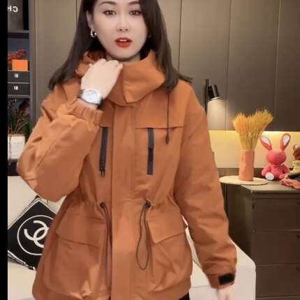 2025秋冬季休闲中长款加棉大衣宽松连帽抽绳收腰夹棉户外冲锋衣女