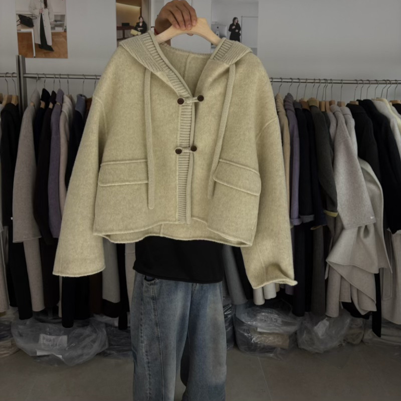 韩版2025连帽双面羊绒大衣拼接针织小个子新款羊毛呢子短款外套