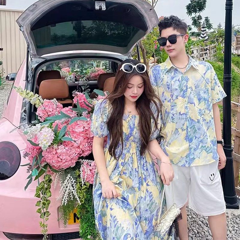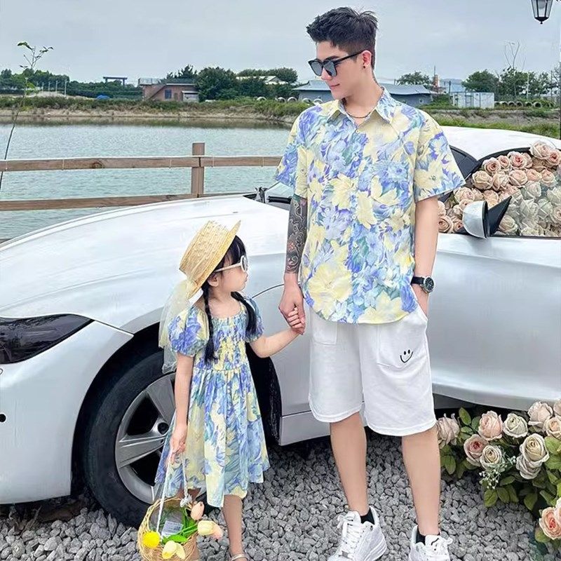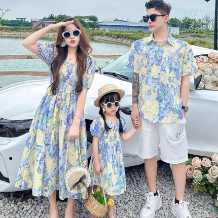 2024夏季花衬衫亲子装一家三口短袖海边度假法式母女装碎花连衣裙