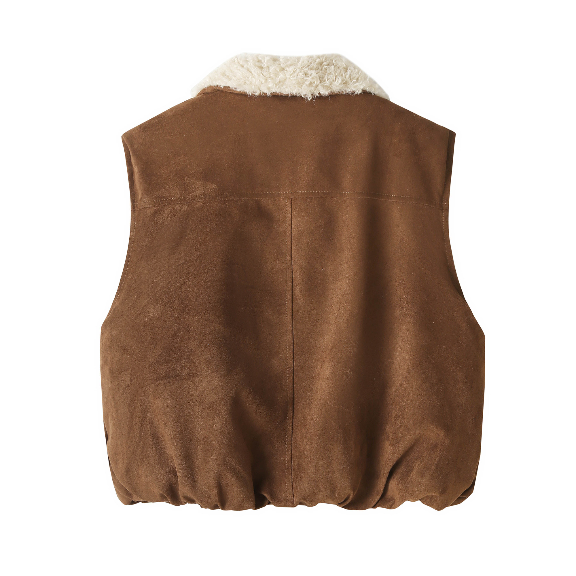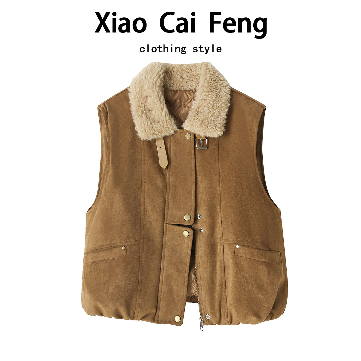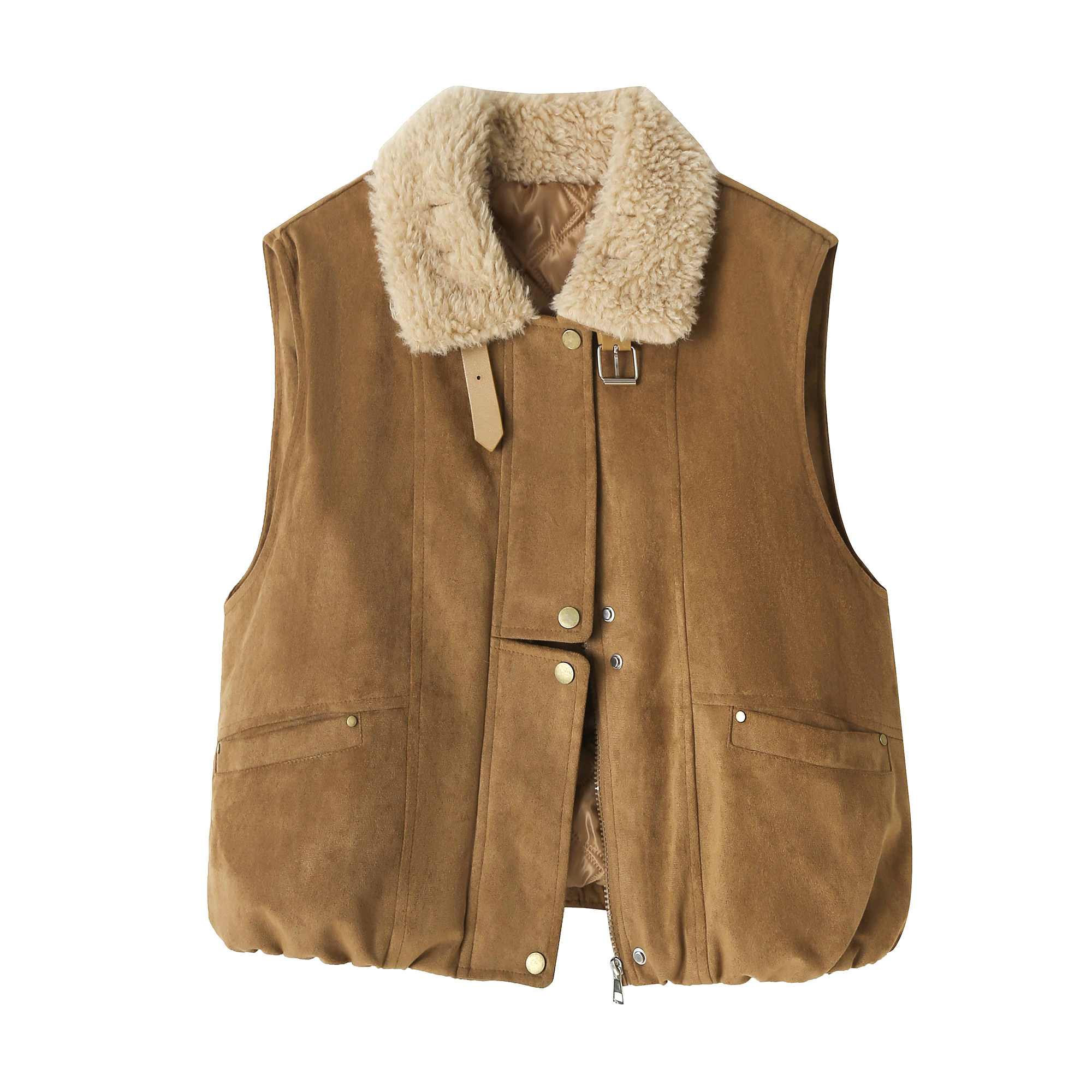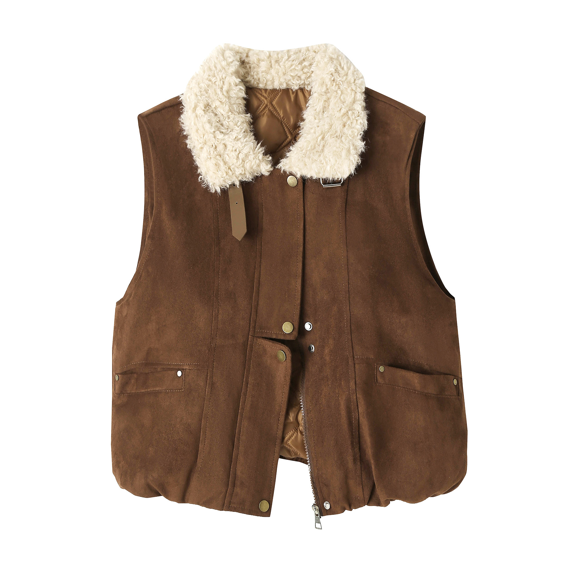 复古美式立领麂皮绒夹棉马甲外套女外穿秋冬厚款保暖叠穿坎肩背心