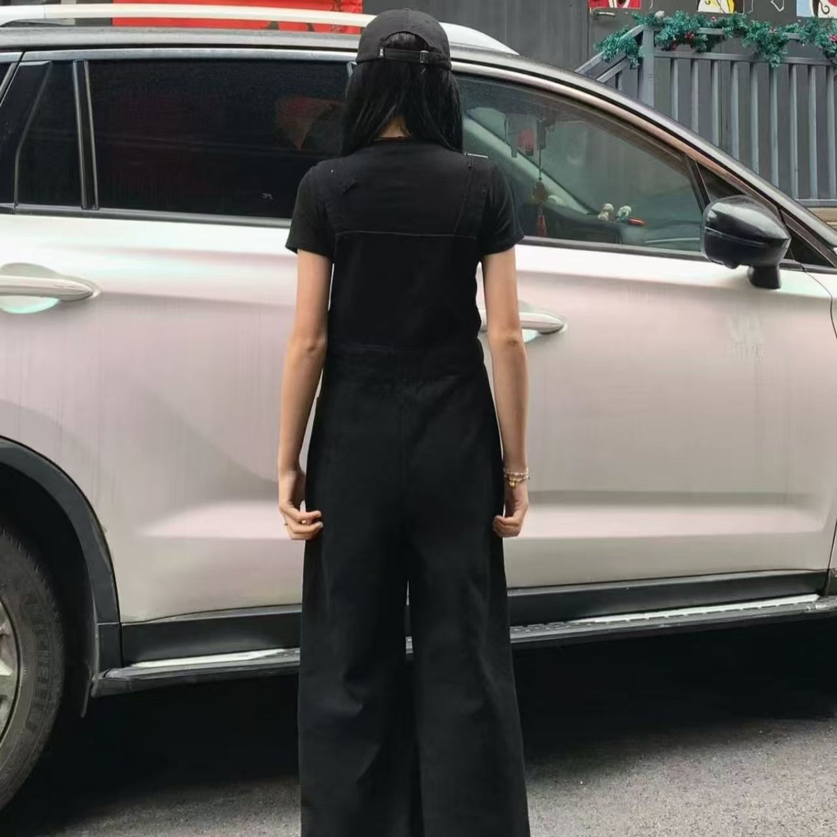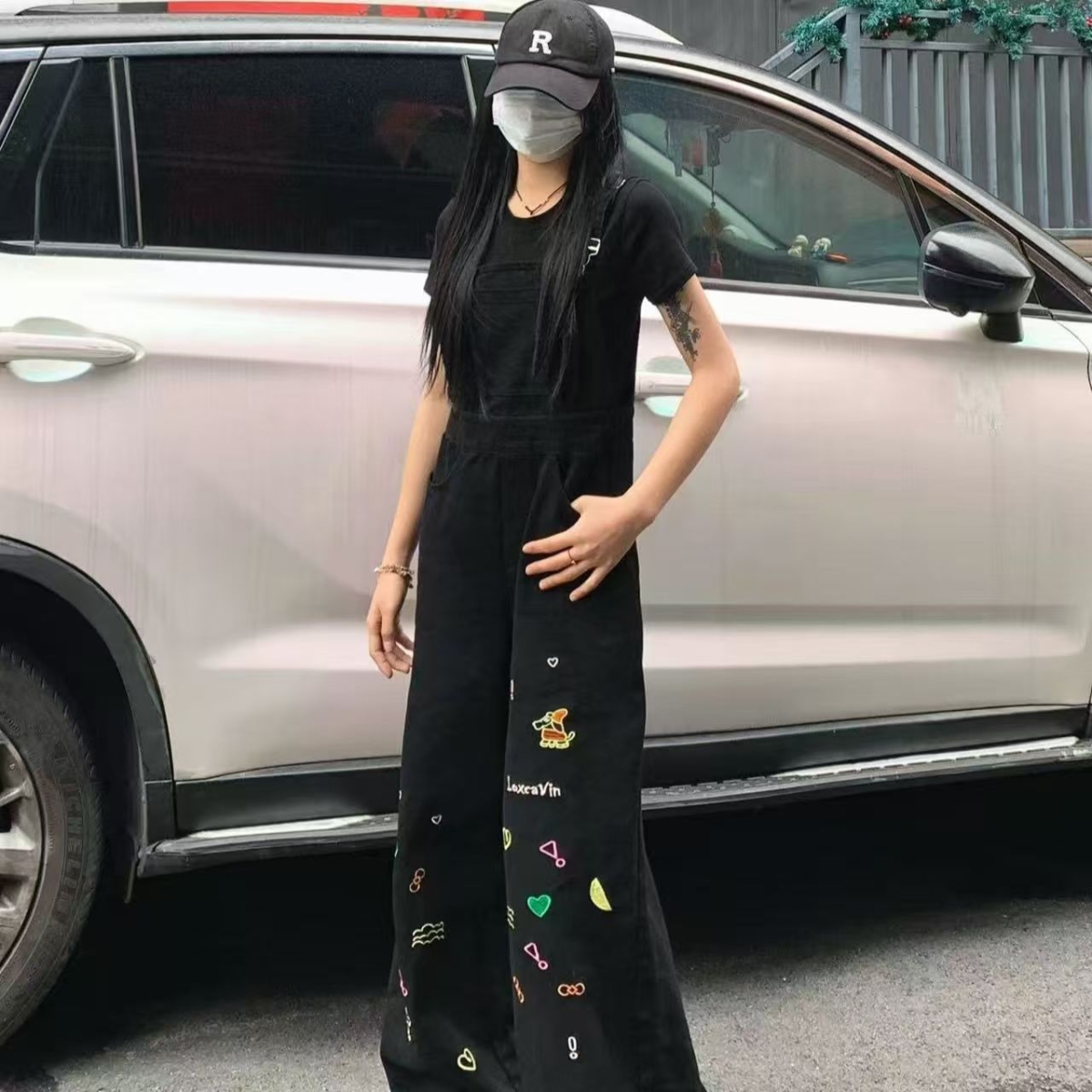 夏季新款美式复古潮重工刺绣牛仔背带裤女龄显瘦直筒休闲阔腿长裤