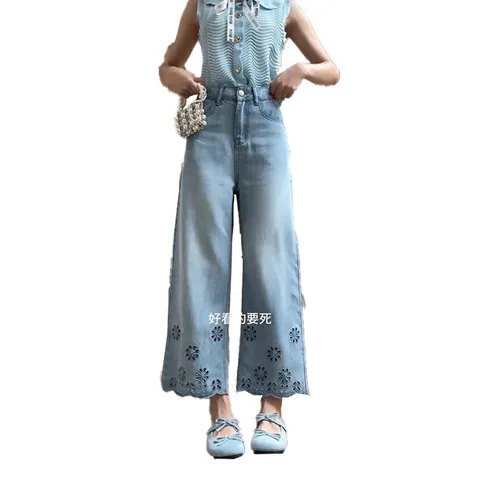 大码九分裤子显瘦勾花牛仔裤镂空高腰阔腿梨形身材欧货薄款女夏季