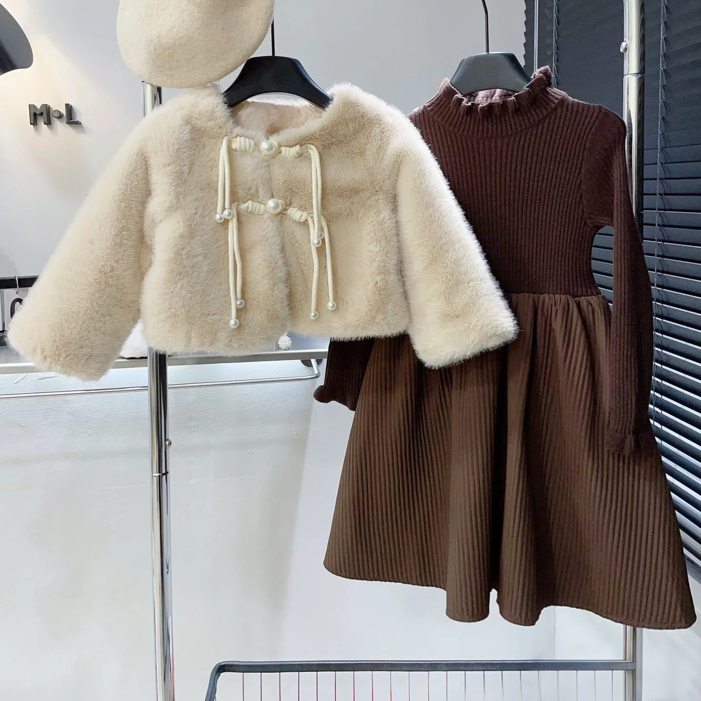 女童连衣裙套装秋冬季2025加厚洋气中国风外套裙子儿童皮草两件套