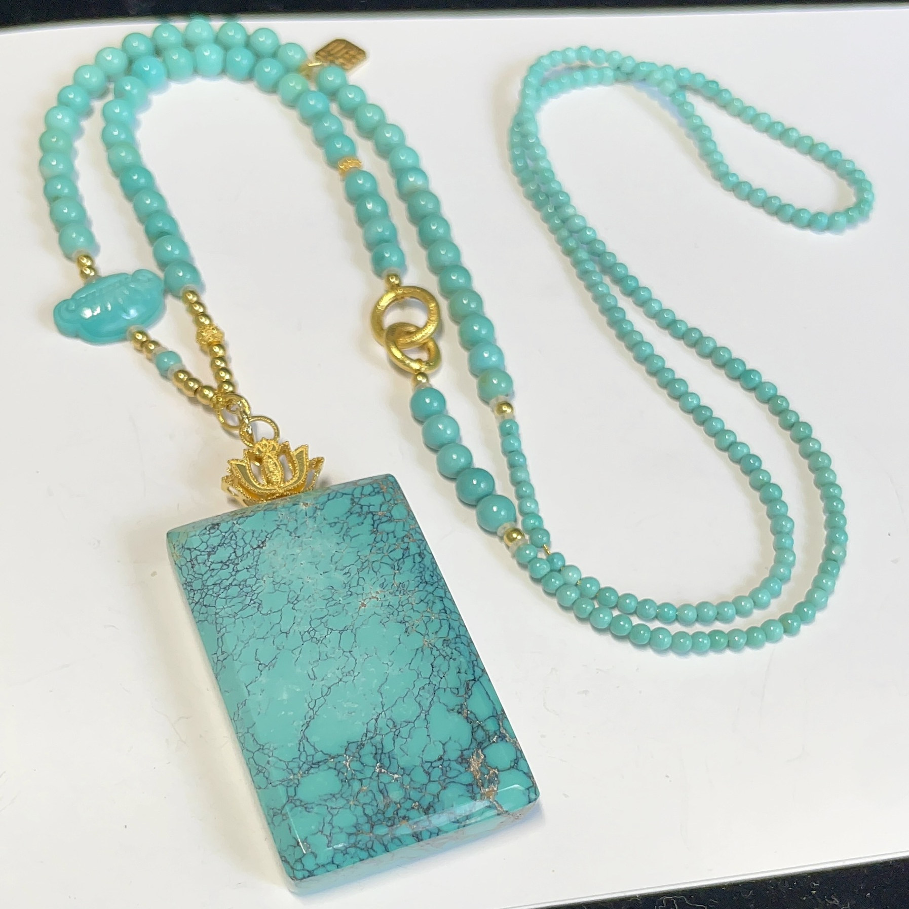 天然羊角山湖北原矿高瓷绿松石平安无事方牌吊坠项链18k金无油