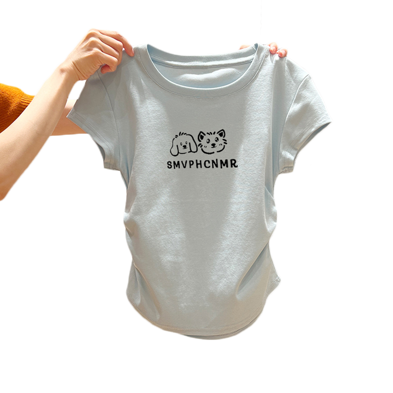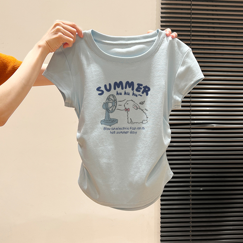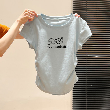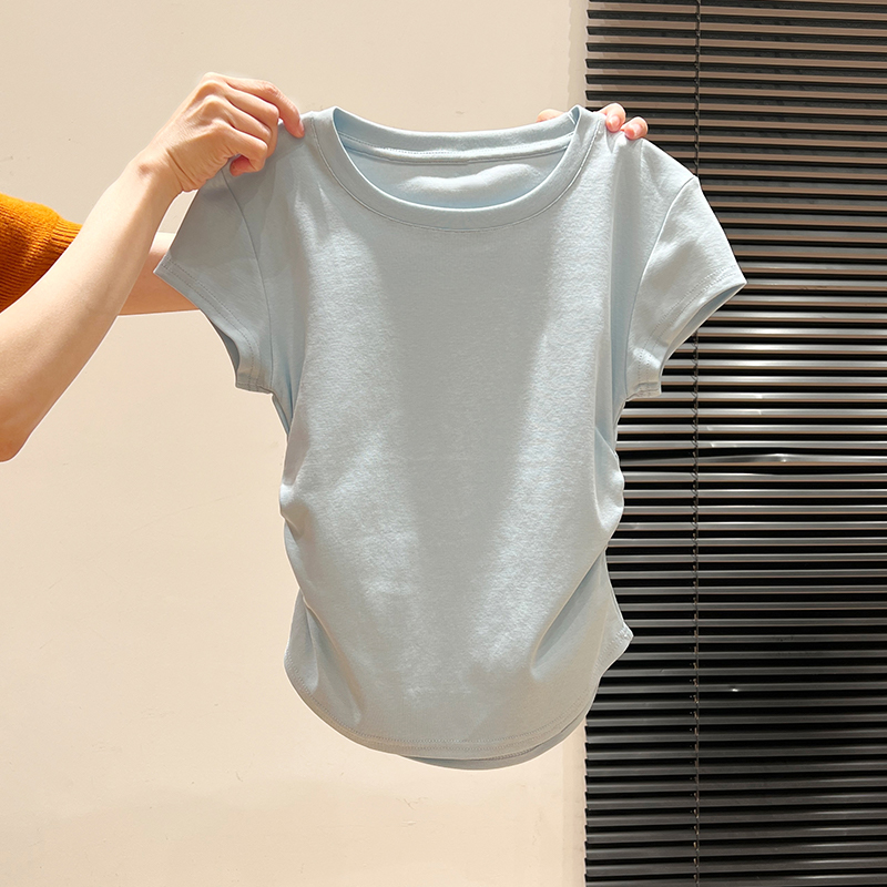 韩里韩气的穿搭蓝色纯棉短袖t恤女夏清纯修身掐腰小众设计感上衣