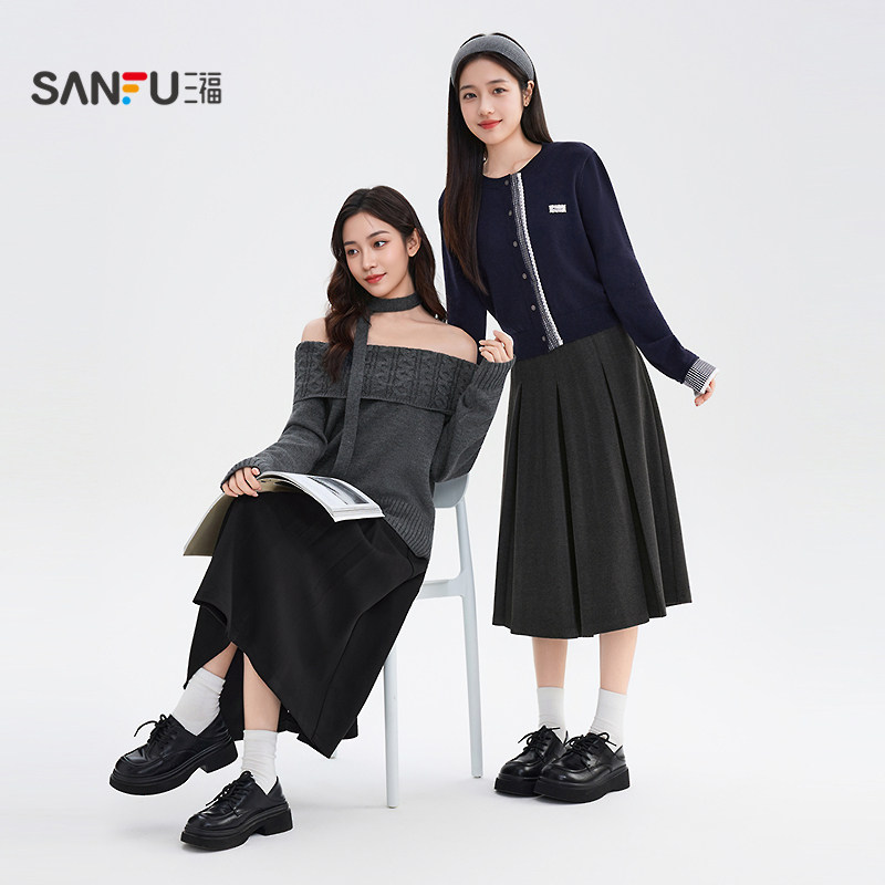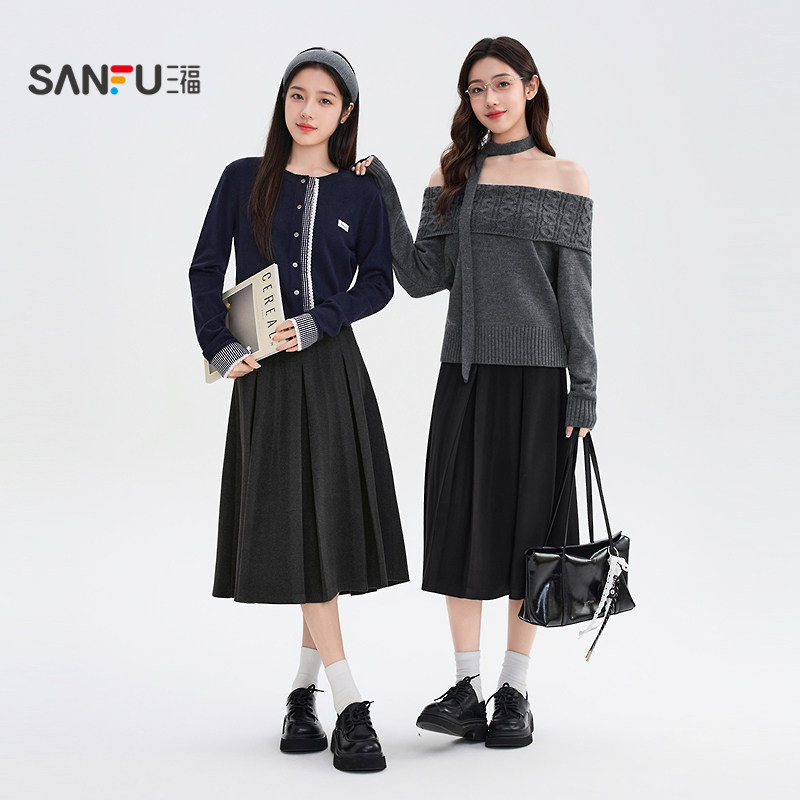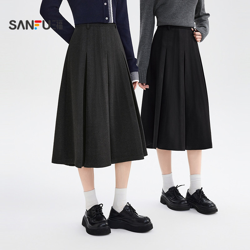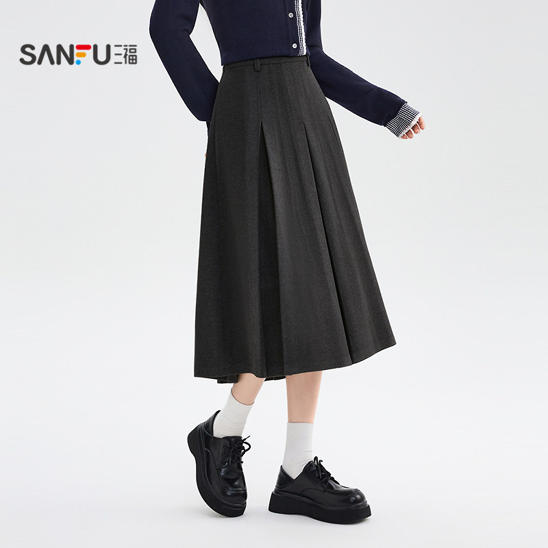 三福半身裙2025新款冬季梨型身材遮跨中长款高腰A字百褶裙子女装