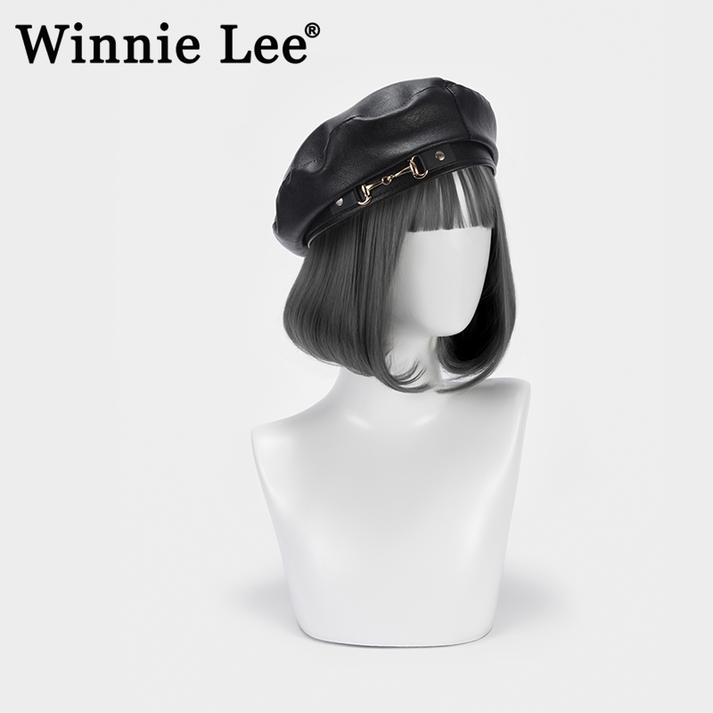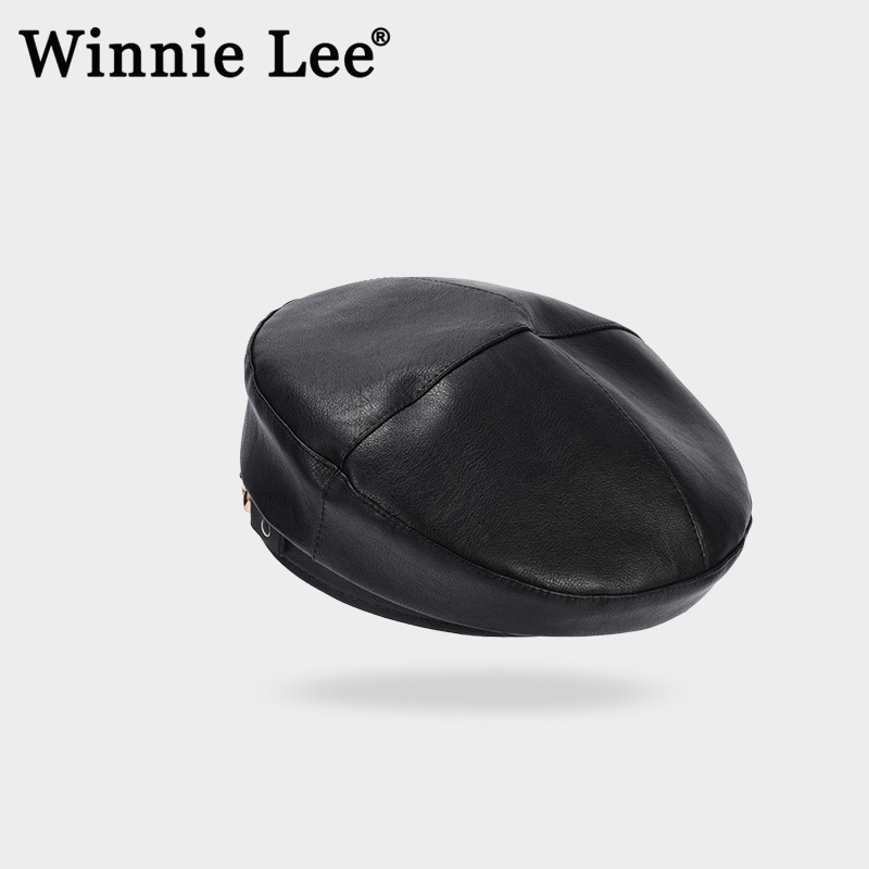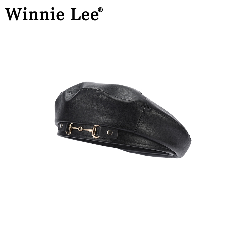 WinnieLeePU皮质贝雷帽女秋冬季