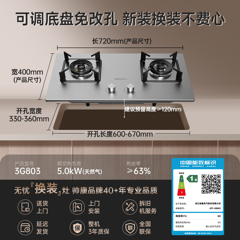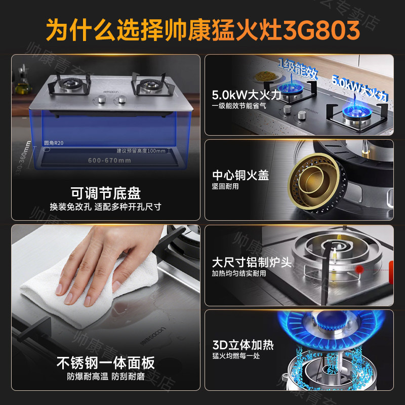 帅康3B803不锈钢燃气灶家用双灶天然气猛火灶液化气煤气灶具补贴
