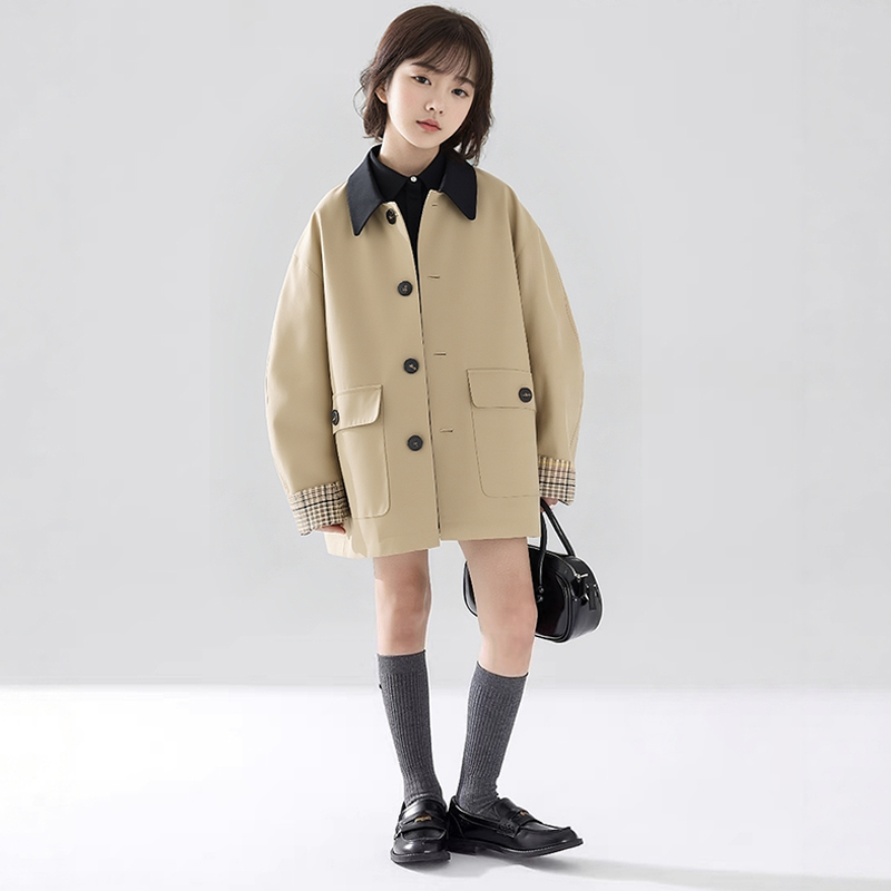 女童复古撞色翻领风衣夹克25秋季新款袖口拼接格纹中长款休闲外套
