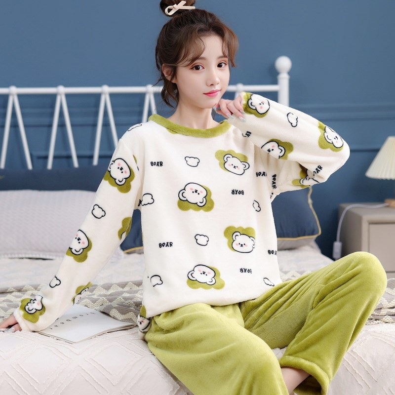 加厚秋冬季法兰绒睡衣女套装珊瑚绒可爱柔软保暖长袖大码家居服