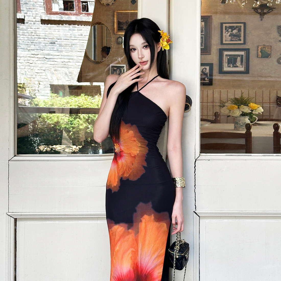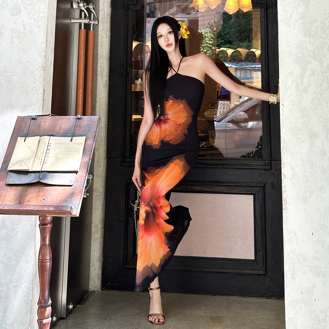 SylCue 辣妹度假风花朵扎染印花显瘦挂脖连衣裙修身百搭包臀长裙