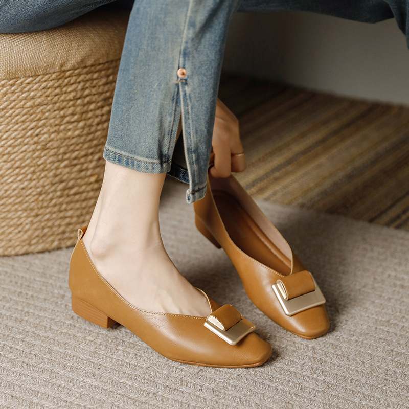 方扣浅口单鞋春秋法式女鞋小方头低跟平底鞋百搭黑色软底奶奶鞋