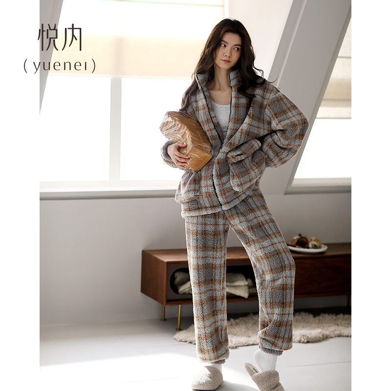 悦内睡衣女款秋冬季冬天法兰绒加厚款加绒珊瑚绒家居服保暖可外穿