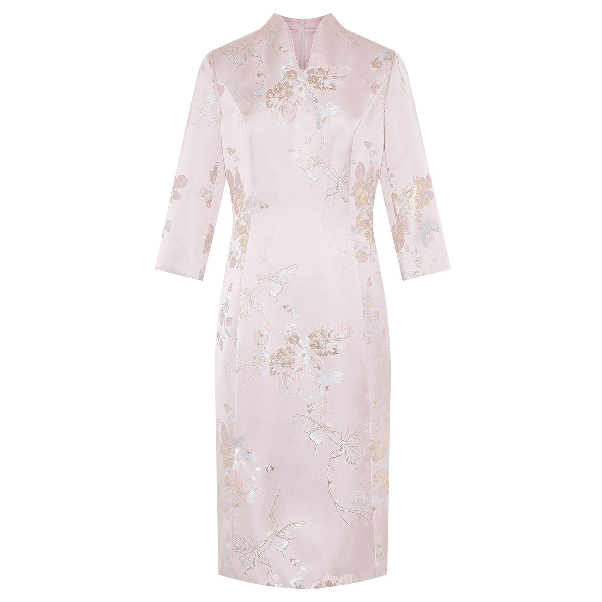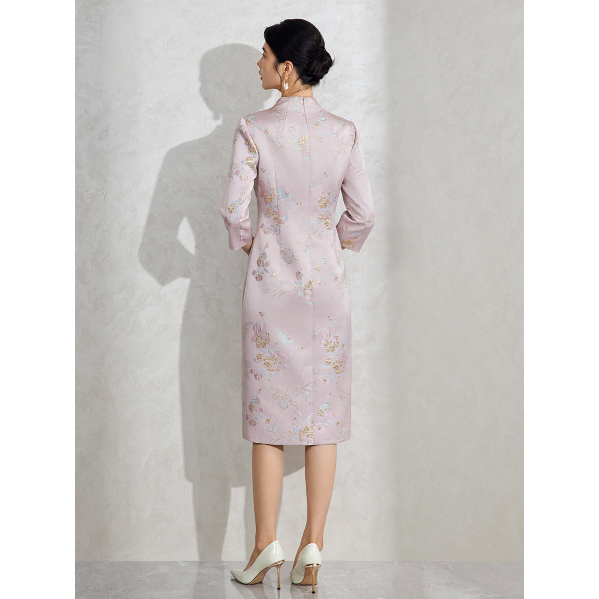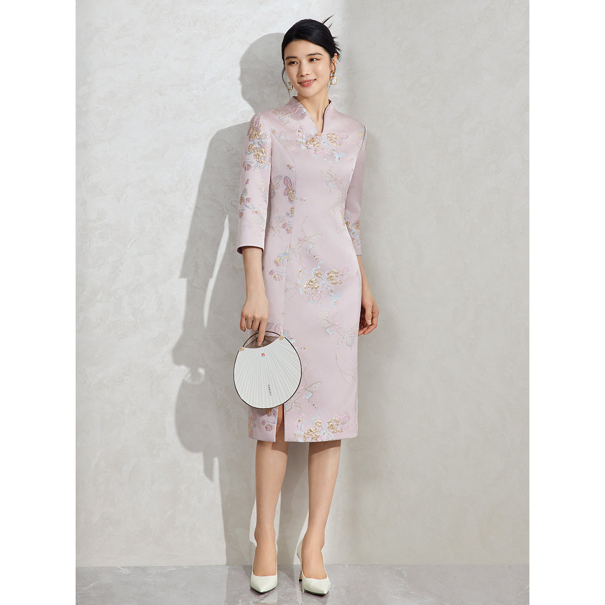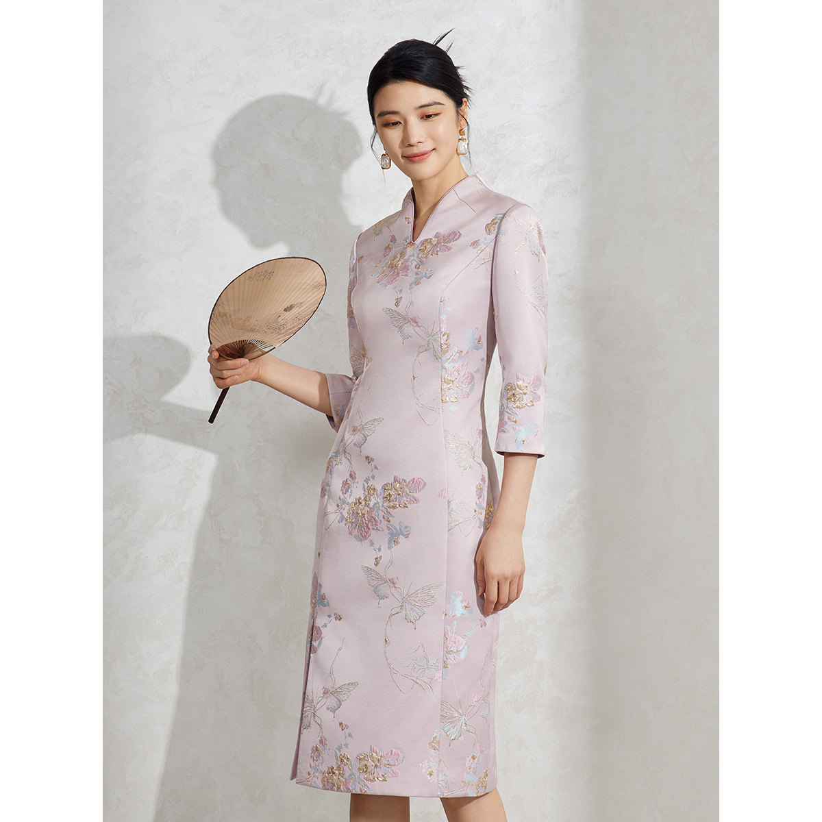 BBLLUUEE/粉蓝衣橱春秋装新款改良新中式精致提花V领礼服连衣裙女