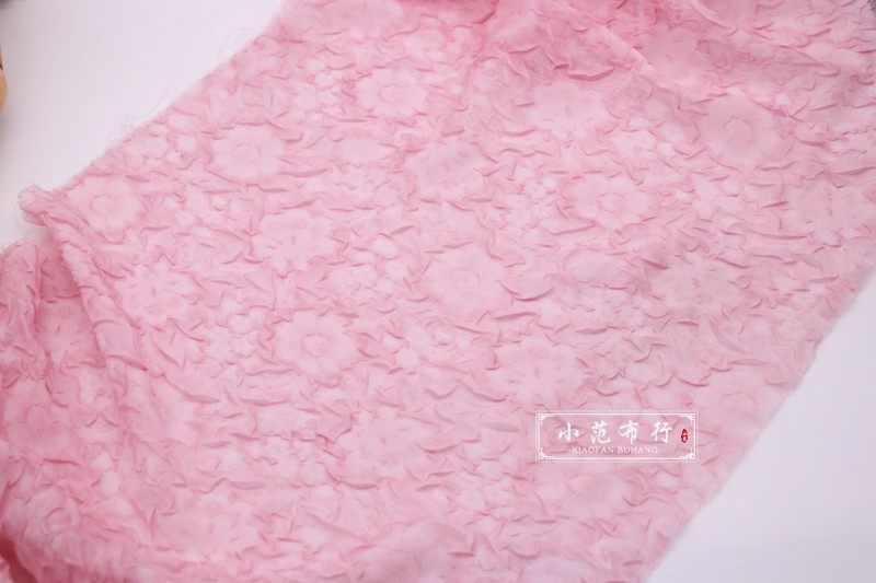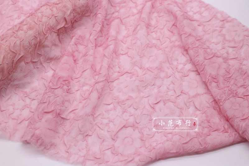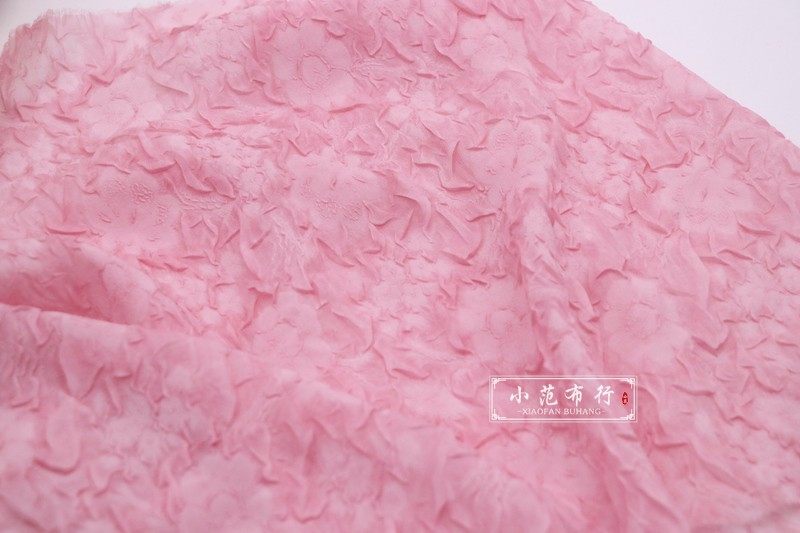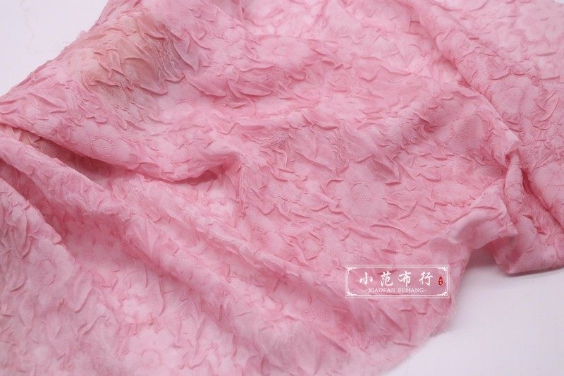 浅粉色山茶花压花褶皱雪纺布料炒色设计师面料柔软细腻旗袍连衣裙