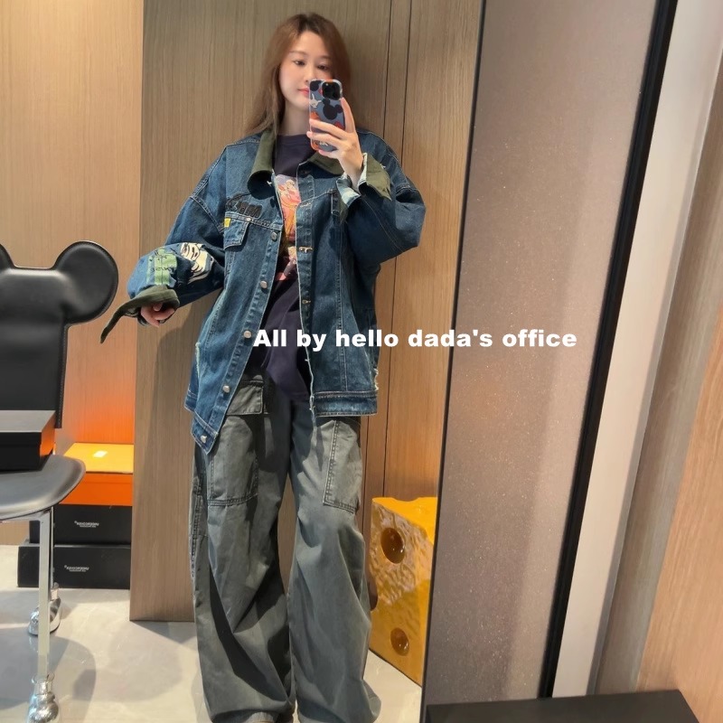 7折仅2天韩国2025秋季新款女装大码oversize刺绣拼接宽松牛仔外套
