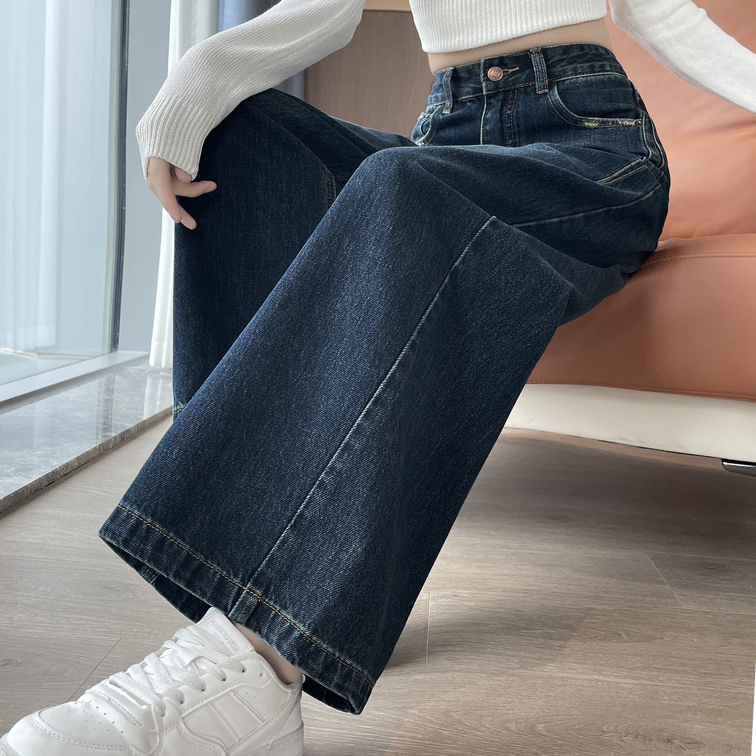 复古深蓝色阔腿牛仔裤女直筒九分